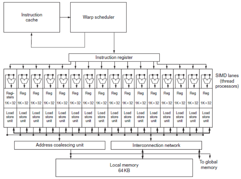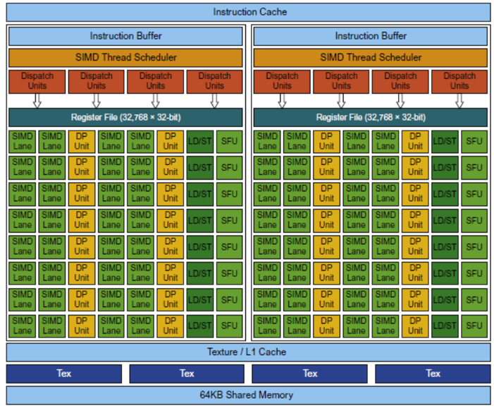 - Two or four SIMD thread schedulers, two instruction dispatch units