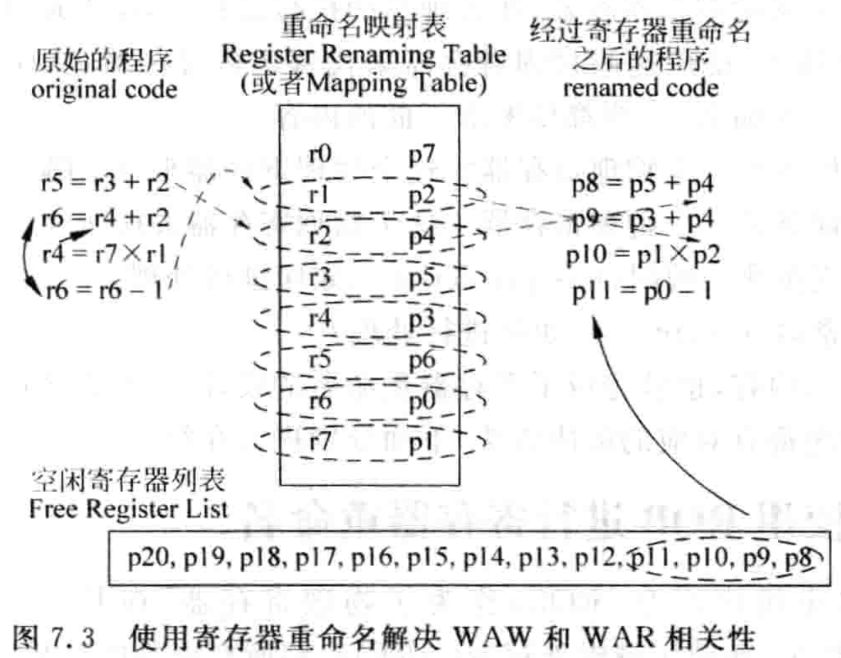 3. 代码重用,一些小函数被频繁调用,即存在 WAW,虽然可以将函数嵌入调用程序中(inline)来解决,但仍然会又上述问题。 简单的增加存储器会导致处理器不兼容,也无法解决代码重用产生的 WAW,最好的方法是使用硬件管理的寄存器重命名(Register Renaming)。处理器中实际存在的寄存器个数要多余 ISA 中定义的通用寄存器个数,这些内部实际存在的寄存器称为物理寄存器(Physical register),ISA 中定义的寄存器称为逻辑寄存器(Logical register, architecture register)。如 MIPS 定义 32 个通用逻辑寄存器,而经过重命名后使用的可以有 128 个物理寄存器,处理器动态地将前者映射到后者以解决假相关性。 重命名映射表(Register Renaming Table, Register Alias Table RAT) 用来保存已有的映射关系。它是一个表格,可以基于 SRAM/CAM 实现。 空闲寄存器列表(Free Register List) 用来记录哪些物理寄存器是空闲的。