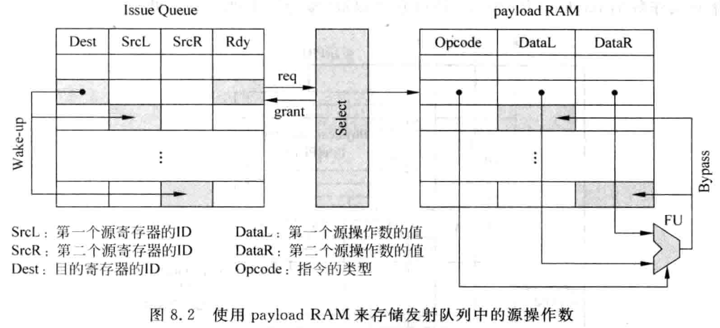可以看出,在 payload RAM 存储了指令源操作数的值,当指令从 IQ 中被仲裁电路选中时,就可以直接从 Payload RAM 中对应的地方将源操作数读取出来,并送到 FU 中去执行。当一条指令从 IQ 中被选中的同时,它会将目的寄存器的编号值进行广播,IQ 中其他指令都会将自身的源寄存器编号和这个广播的编号值进行比较,一旦发现相等的情况,则在 payload RAM 对应位置标记,当那条被选中的指令在 FU 中计算完毕时,就会将它的结果写到 payload RAM 这些对应位置中,这是通过 bypassing network 实现的,这个方式就像是 payload RAM 在捕捉 FU 计算结果,所以称为数据捕捉结构,IQ 负责比较寄存器的编号是否相等,而 payload RAM 负责存储源操作数,并捕捉对应 FU 结果。