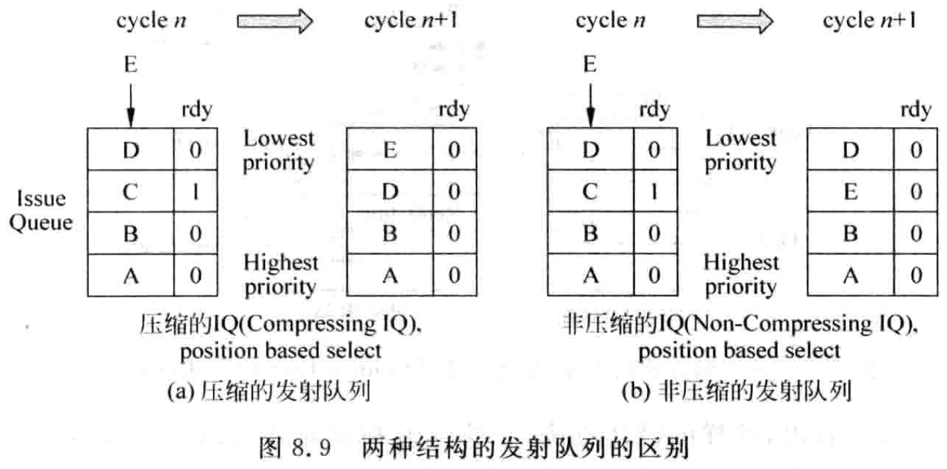 在图 8.9 所示的两种发射队列中,都根据指令在发射队列中的位置对其进行选择 (称为 positionbased select),图 8.9 (a) 的发射队列采用了压缩的结构,每次总是能保证选中最旧的指令,新来的指令只需要从发射队列的上部写入就可以了,如指令 E 所示;图 8.9 (b) 的发射队列采用了非压缩的结构,此时本质上是一种随机的选择,不能保证选中最旧的指令,新来的指令需要从发射队列中找到一个空闲的位置,例如指令 E。当然,这只是找到一个空闲的位置,相对还是比较容易的,当每周期需要找到几个空闲的位置时,实现起来就不是那么容易了。