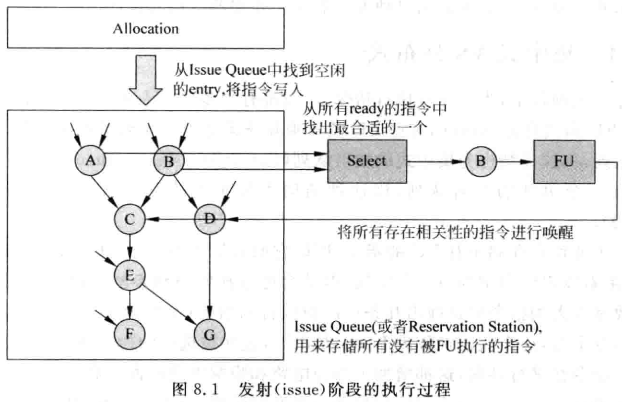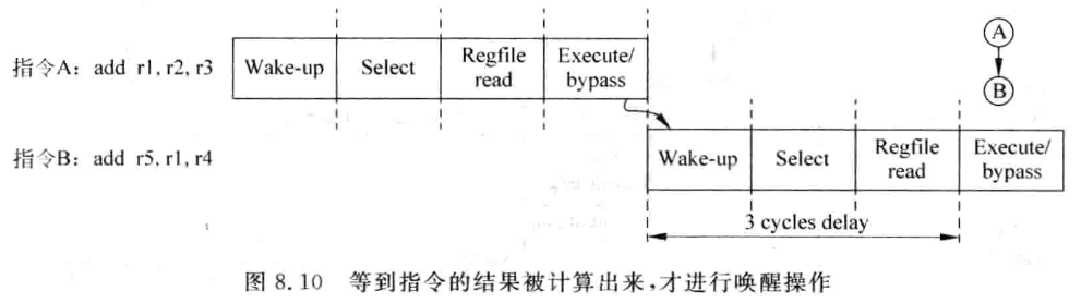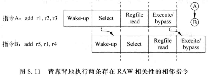 在图 8.10 中,发射 (issue) 过程被分为了唤醒 (Wake-up) 和仲载 (Select) 两个流水线阶段,在唤醒阶段,发射队列中的所有相关的寄存器会被置为准备好的状态,而在仲裁阶段,会使用仲裁电路从发射队列中选择一条最合适的指令送到 FU 中,这是发射过程最典型的流水线划分。从图 8.10 可以看出,两条存在先写后读 (RAW) 相关性的指令,不能获得背靠背的执行,它们的执行之间相差了三个周期,这样的执行效率显然还不是最高的。