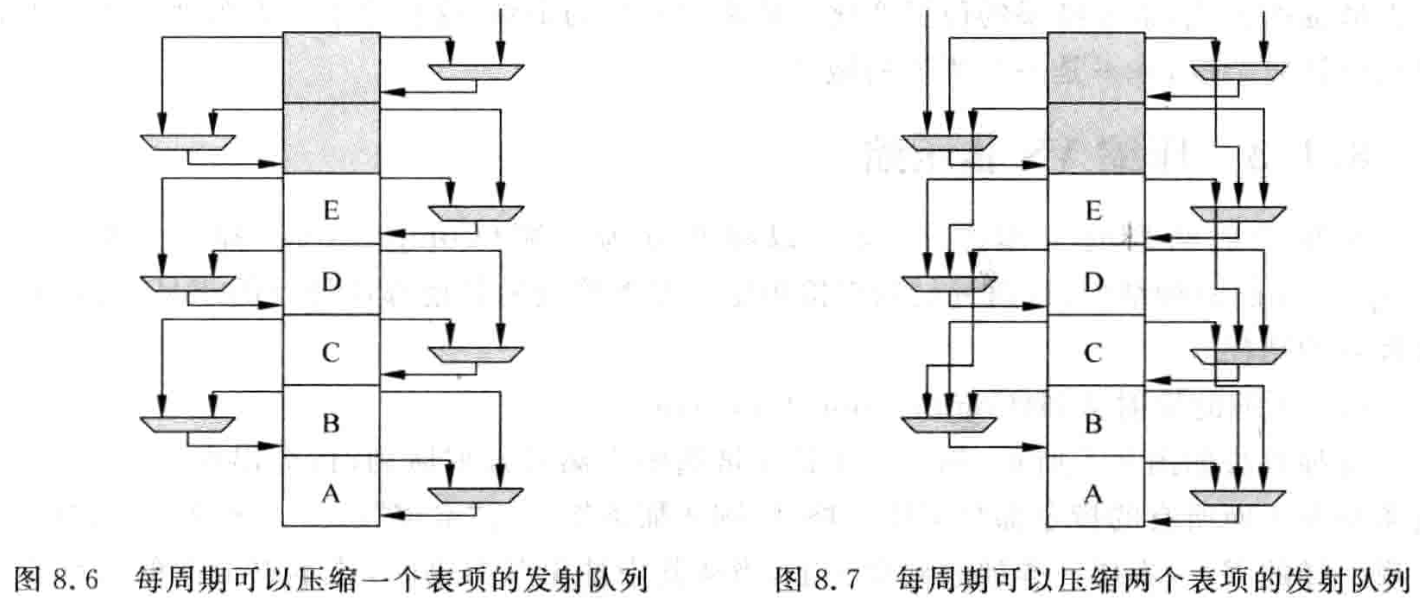 而且,每周期从发射队列中离开的两条指令不是靠在一起时 (这种情况很常见),例如图 8.7 中指令 B 和指令 D 同时被选中而离开了发射队列,则在压缩时,指令 C 需要向下移动一个格,而指令 E 需要向下移动两个格,因此还需对不同表项的多路选择器产生不同的控制信号,这样也显著地增加了设计的复杂度。