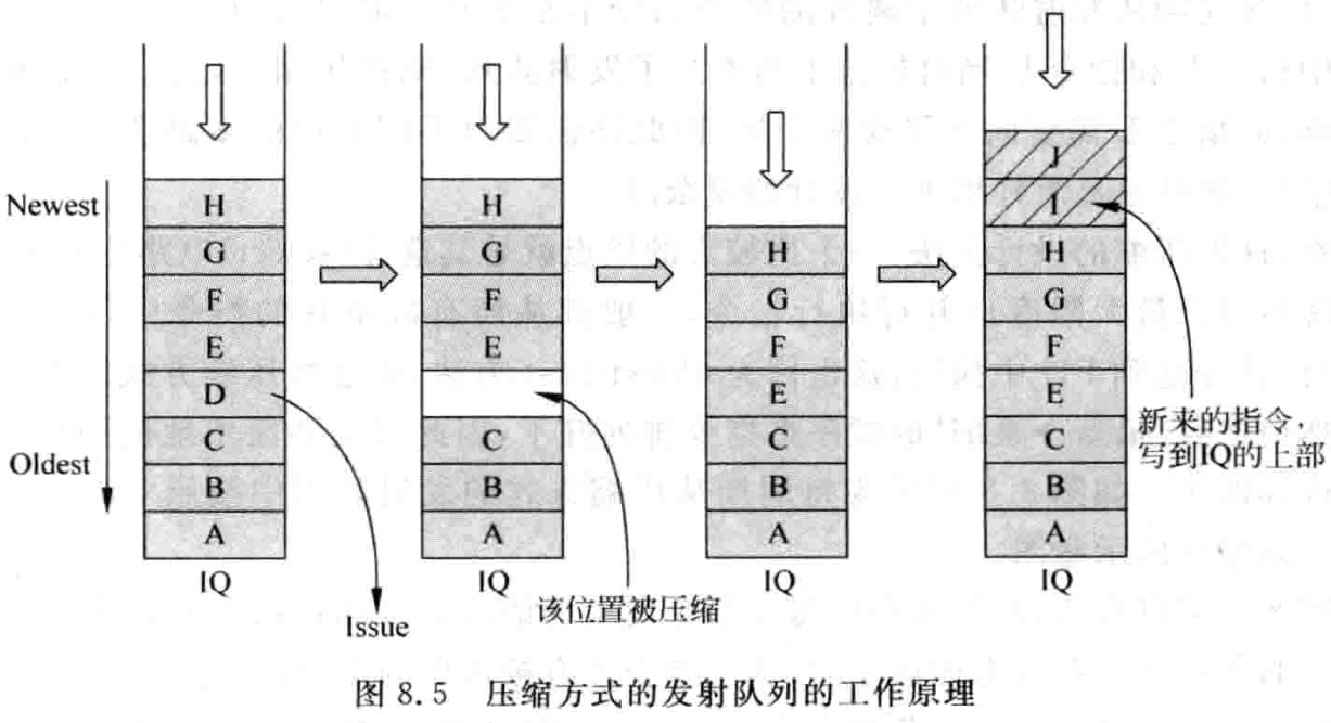 这种方法如图 8.5 所示,每当一条指令被选中而离开发射队人列时,会出现一个 ” 空隙 “,这条指令上面所有的指令都会下移一格,将刚才那条指令的 ” 空隙 ” 填上。想象一下,有 n 本一模一样的书,一本压一本地放到桌子上, 当从其中抽出某本书时,这本书上面的书都会下移,此时整体上这摞书的高度下降了,但是在这摞书中间并没有空隙。再看图 8.5 中的发射队列,想象有一个东西在向下压它,当一条指令离开而导致发射队列中出现空闲的空间时,在下压力的作用下,那个空闲的空间就会被 ” 挤走 “,这样发射队列当中所有的指令又都是紧紧地靠在一起了。而且发射队列当中的这些指令,从上往下看,是按照 ” 最新→最旧 ” 的顺序排列的,新来的指令会从发射队列上面的空闲空间开始写入。