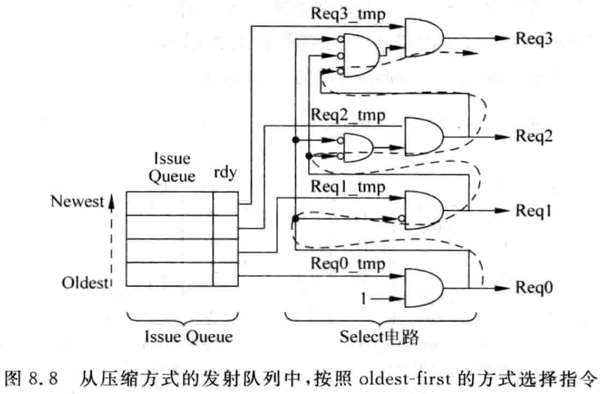从图 8.8 可以看出,发射队列中每条指令发出的请求信号都受到它之前指令的影响,只有比它旧的所有指令都没有被选中时,这条指令才有被选中的资格,通过图 8.8 所示的与逻辑可以实现这个功能; 如果有任何一条指令在当前周期被选中了,则比它新的所有指令都不能够在本周期被选中,这样就按照 oldest-first 的原则,从人发射队列的所有指令中选择一条最合适的指令送到 FU 中执行。