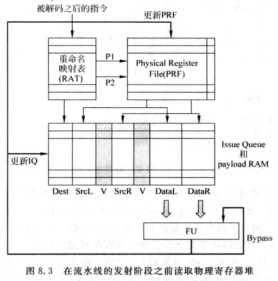 在流水线的发射阶段之前读取寄存器,称为数据捕捉 Data-capture 的结构。被寄存器重命名后的指令首先读取 PRF,然后将读取的数值随着指令写入发射队列中,如果有的寄存器的值还没有被计算出来,则会将寄存器编号写入 IQ,以供唤醒的过程使用,它会被标记为无法获得的状态,这些寄存器在之后通过旁路网络得到它们的值,不再需要访问物理寄存器。IQ 中,存储指令操作数的地方叫做 Payload RAM。