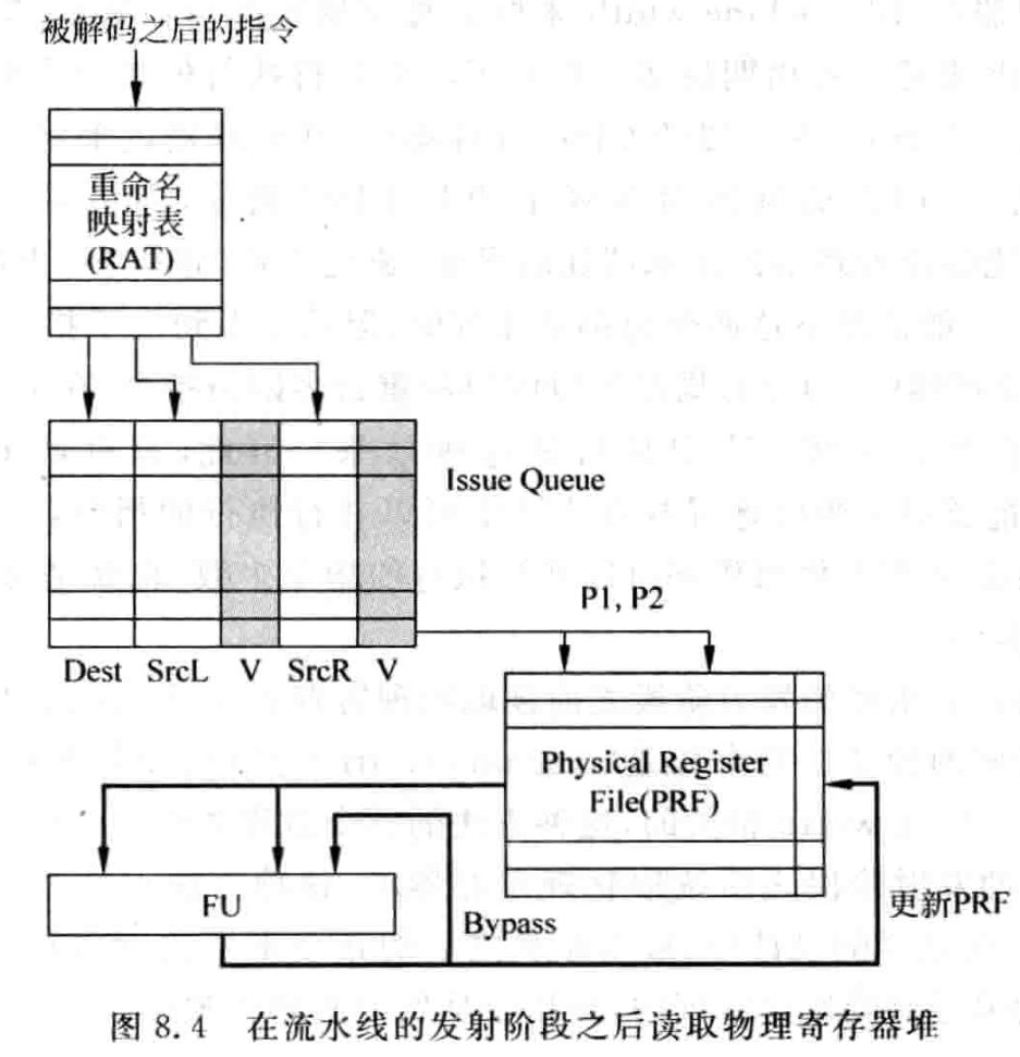 在图 8.5 中,当指令 D 被选中而离开时,在发射队列中就会出现空闲的位置,经过压缩之后,这个空闲的位置会被 ” 挤掉 “,这样所有的指令又都靠在一起了,这就是压缩方式的发射队列。通过这种方式,可以保证空闲的空间都是处于发射队列的上部,此时只需要将重命名之后的指令写到发射队列的上部即可,例如图 8.5 中的指令 J 和指令 I。