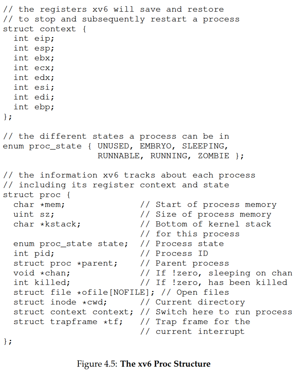 - The process is the major OS abstraction of a running program. At any point in time, the process can be described by its state: the contents of memory in its address space, the contents of CPU registers (including the program counter and stack pointer, among others), and information about I/O (such as open files which can be read or written).