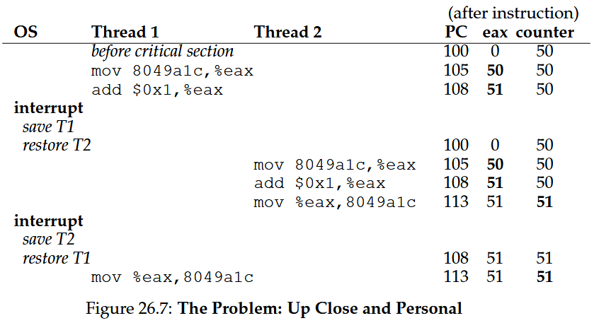 A major issue arises with shared data: threads updating a shared variable (e.g., a counter) often yield incorrect results due to race conditions—outcomes depend on execution timing, caused by non-atomic instruction sequences (e.g., loading, incrementing, storing a counter). The core of race conditions are the uncontrolled scheduling of the instructions.