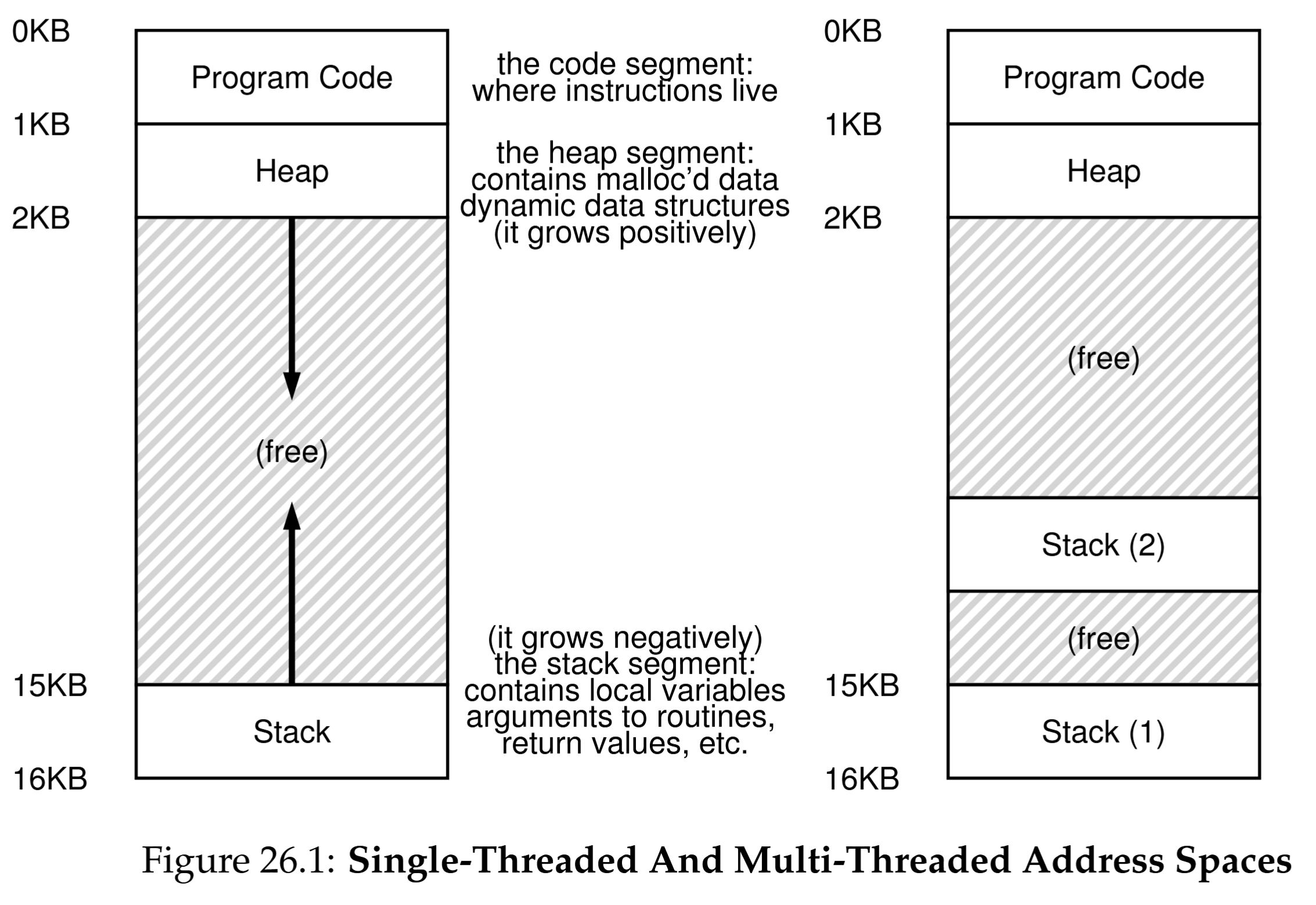 In this figure, you can see two stacks spread throughout the address space of the process. Thus, any stack-allocated variables, parameters, return values, and other things that we put on the stack will be placed in what is sometimes called thread-local storage, i.e., the stack of the relevant thread.