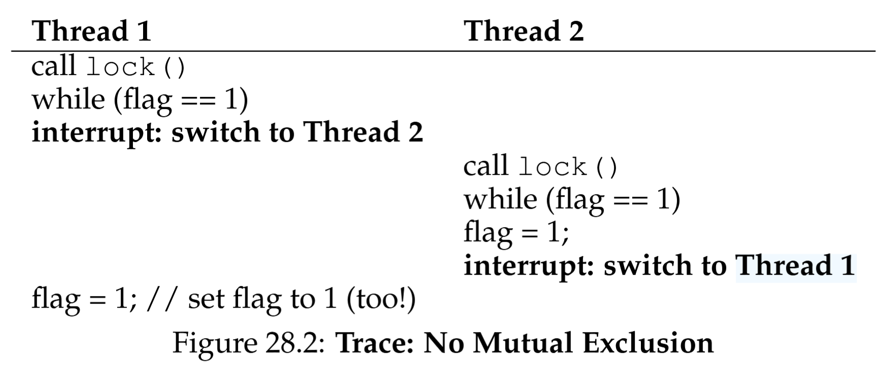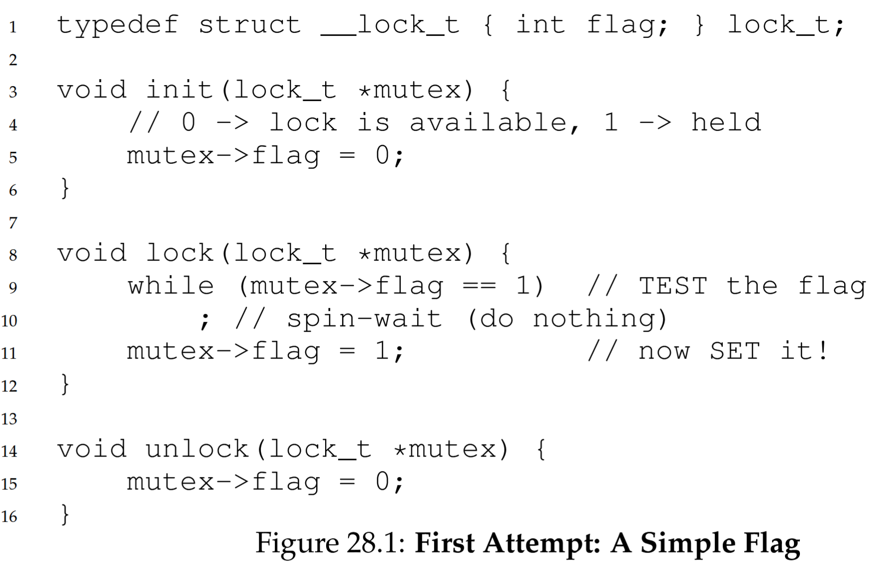 A lock is just a variable, and thus to use one, you must declare a lock variable of some kind (such as mutex above). This lock variable (or just “lock” for short) holds the state of the lock at any instant in time. It is either available (or unlocked or free) and thus no thread holds the lock, or acquired (or locked or held), and thus exactly one thread holds the lock and presumably is in a critical section.