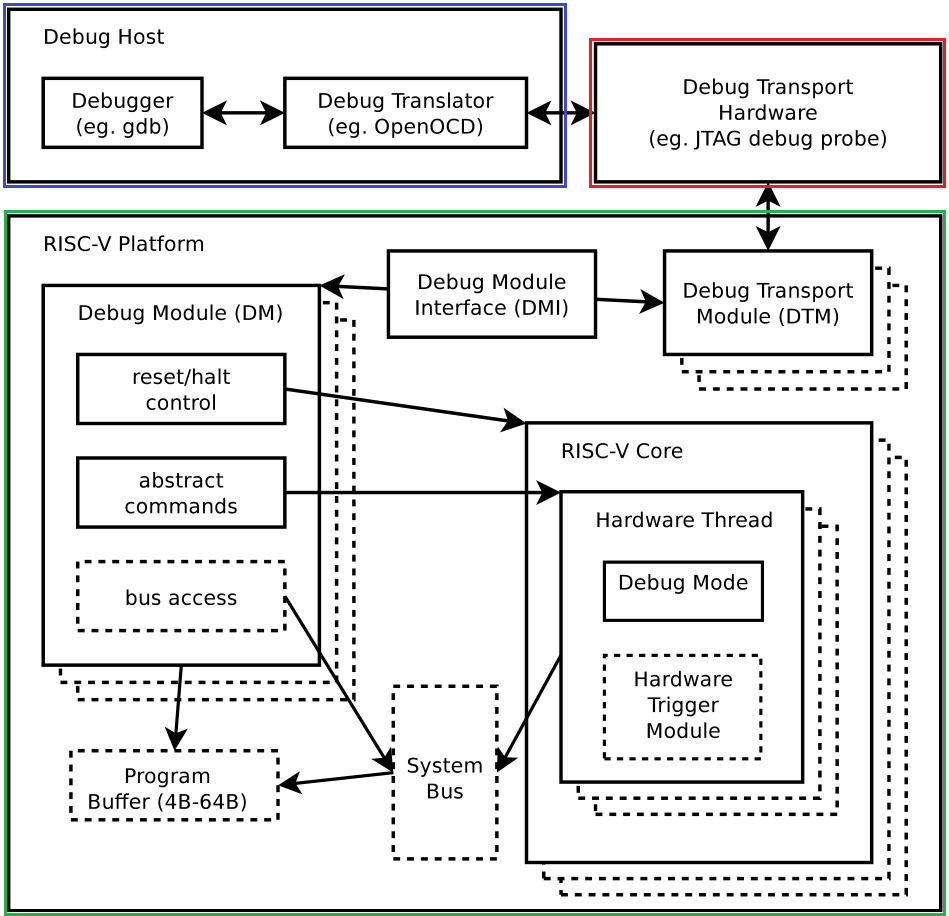 可以看到主要分为3个部分,分别是Debug Host,可以理解为PC;Debug Hardware,可以理解为JLink或者CMSIS-DAP这样的调试工具;第三部分就是嵌入在芯片内部的调试模块。在调试模块内部,与调试工具直接交互的是DTM模块,DTM模块通过DMI接口与DM模块交互。