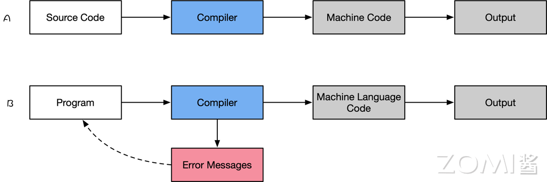- 编译器读取源程序代码,输出可执行机器码,即把开发者编写的代码转换成 CPU 等硬件能理解的格式