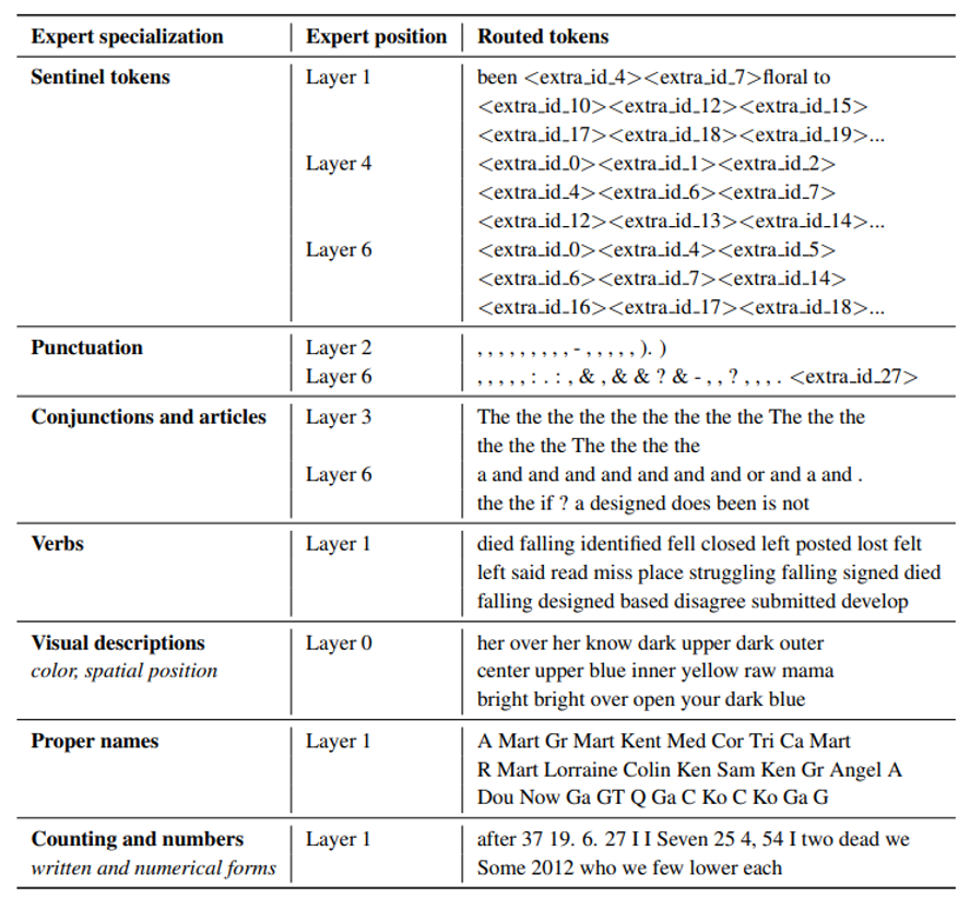 那么 MOE 专家是如何学习的呢?ST-MoE 的研究者们发现,编码器中不同的专家倾向于专注于特定类型的 token 或浅层概念。例如,某些专家可能专门处理标点符号,而其他专家则专注于专有名词等。与此相反,解码器中的专家通常具有较低的专业化程度。