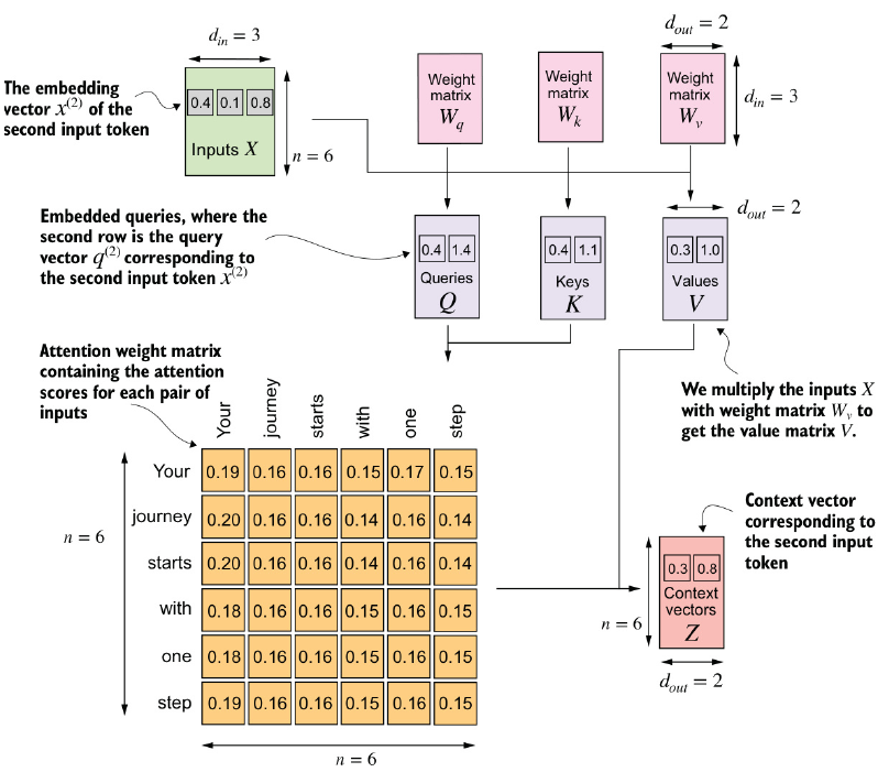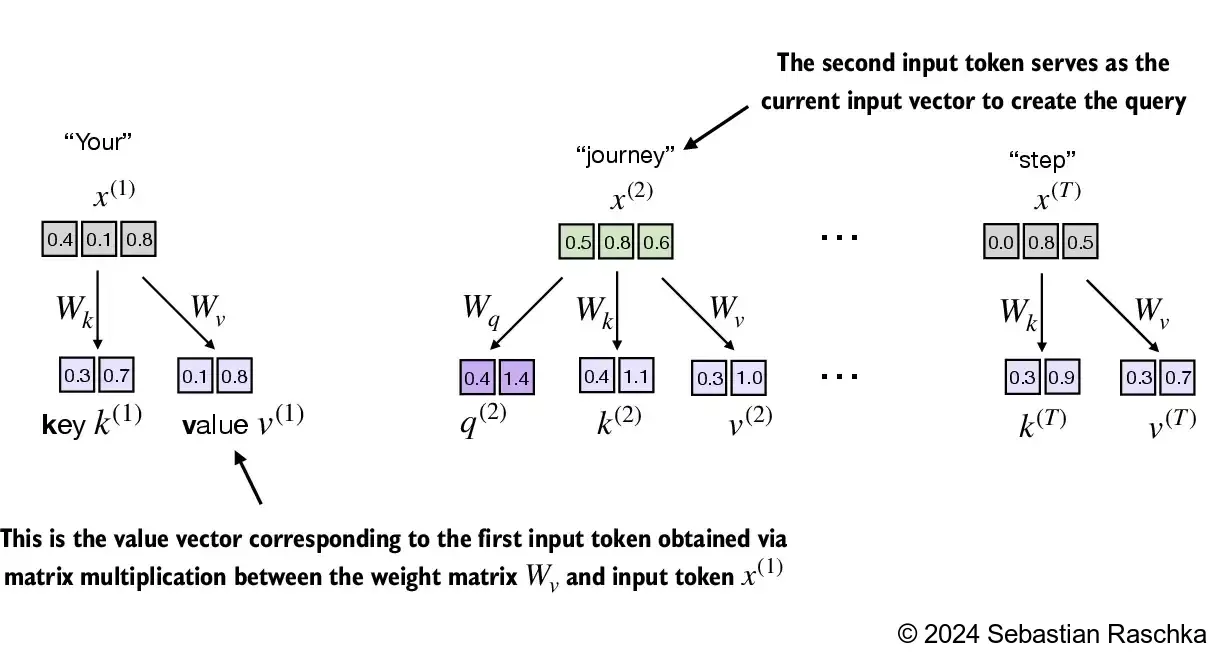 • 在用于大语言模型的自注意力机制 (也被称为“缩放点积注意力”) 中,我们引入了可训 练的权重矩阵来计算输入的中间变换: 查询矩阵、值矩阵和键矩阵。