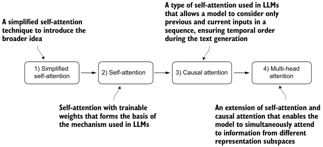 本章将要实现的不同注意力机制。我们将从一个简化版本的自注意力机制开始,然后逐 步加入可训练的权重。因果注意力机制在自注意力的基础上增加了额外掩码,使得大语 言模型可以一次生成一个单词。最后,多头注意力将注意力机制划分成多个头,从而使 模型能够并行捕获输入数据的各种特征