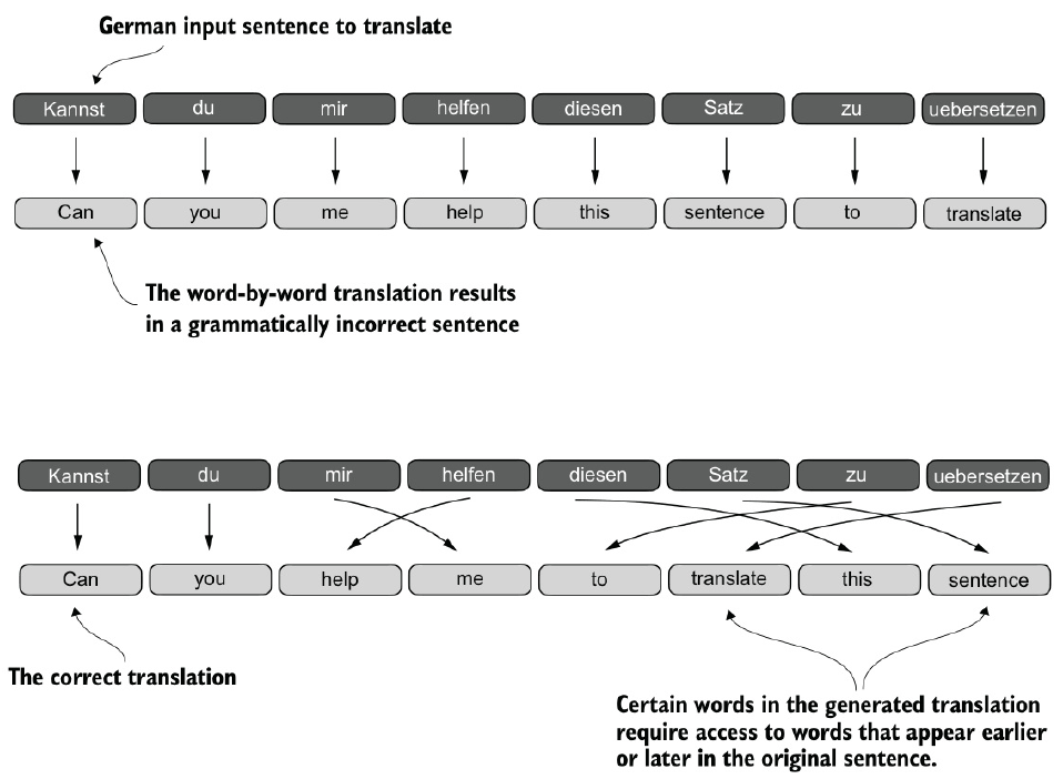 在将文本从一种语言翻译成另一种语言 (比如从德语翻译成英语) 时,不能仅仅逐词翻 译。相反,翻译过程需要理解上下文和进行语法对齐