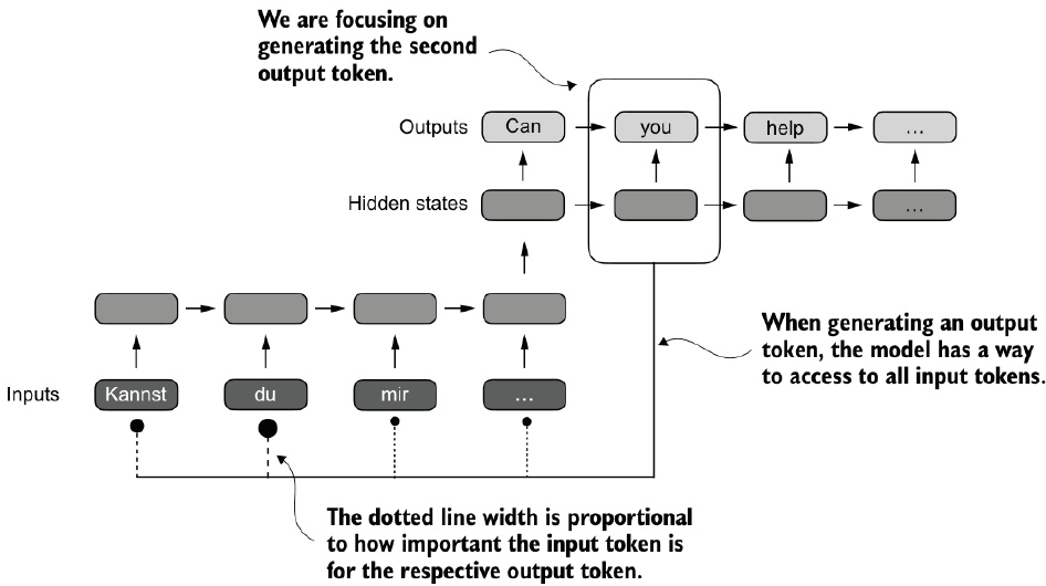 图 3-5 通过使用注意力机制,网络的生成文本解码器部分可以有选择地访问所有输入词元。这 意味着对于生成一个特定的输出词元,某些输入词元比其他输入词元更重要。这种重要 性由注意力权重决定,我们将在后面计算这些权重。需要注意的是,这里展示的是注意 力机制的基本概念,并未描述 Bahdanau 机制 (一种 RNN 方法,但其超出了本书的讨论 范畴) 的具体实现