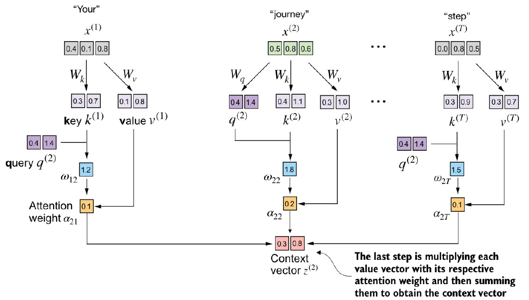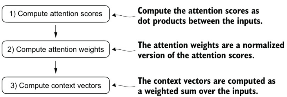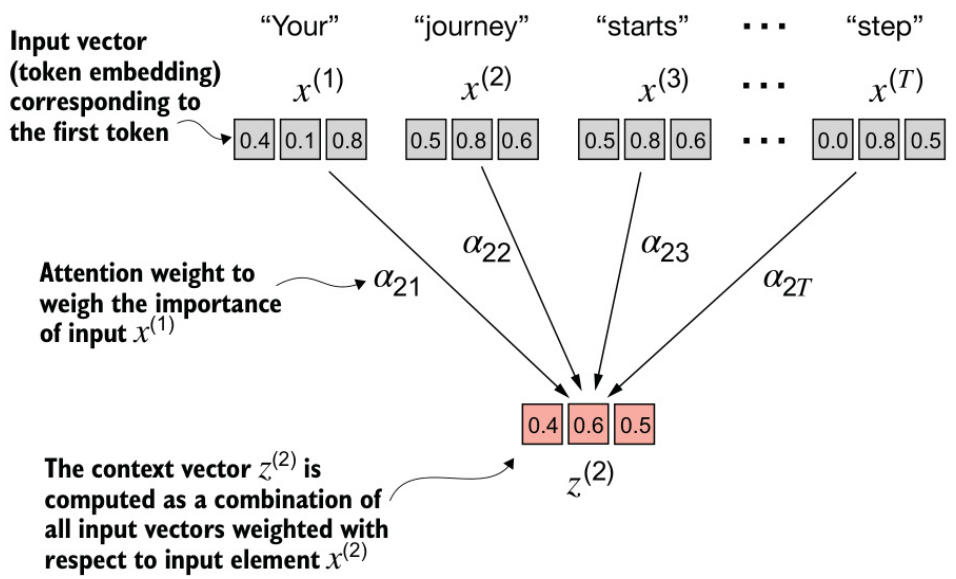 • 注意力机制可以将输入元素转换为增强的上下文向量表示,这些表示涵盖了关于所有输 入的信息。