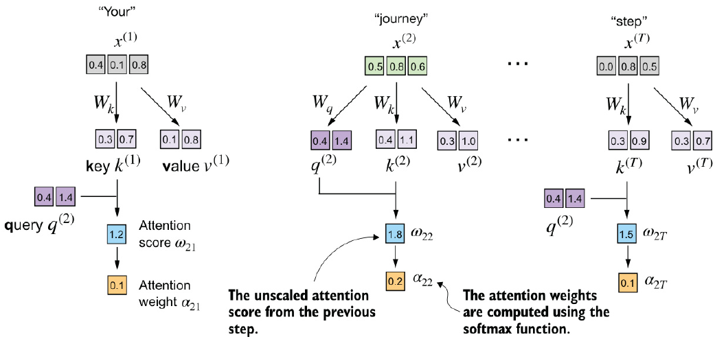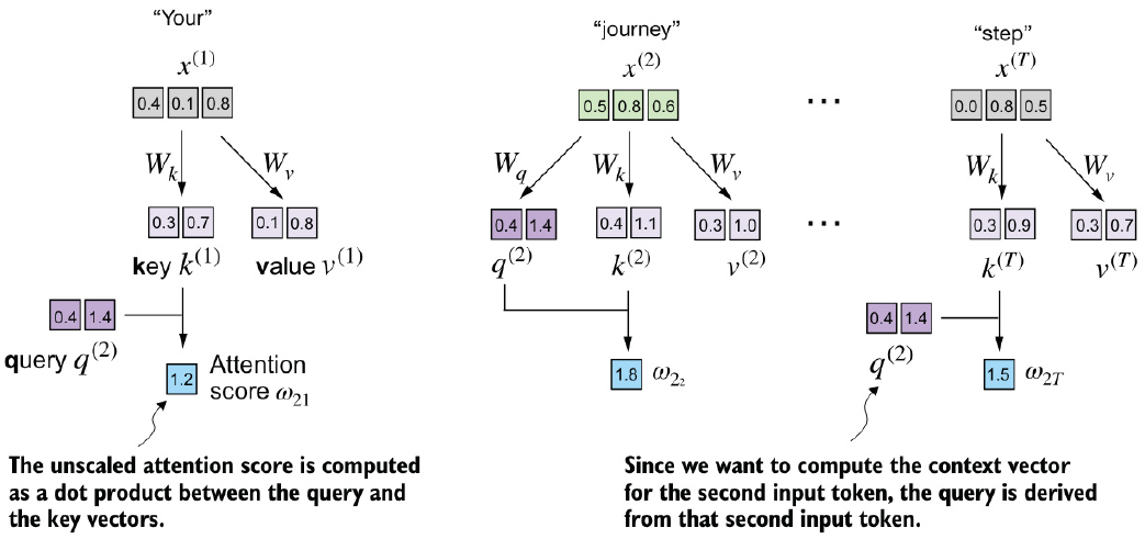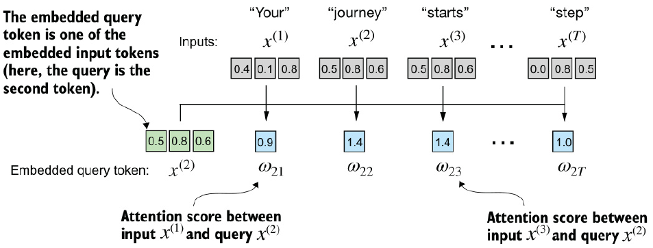 图 3-8 展示了如何计算查询词元与每个输入词元之间的中间注意力分数。我们通过计算查询 词元 与其他所有输入词元的点积来确定这些分数: