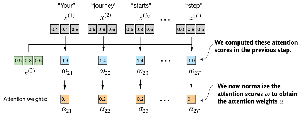 在下一步中,如图 3-9 所示,我们将对先前计算的每个注意力分数进行归一化处理。归一化的目的是让注意力权重总和为 1,便于解释为“相对重要性”,且提升训练稳定性。主流方法是Softmax 函数(保证权重为正,且极值处理更优)。以下是一种实现这一归一化步骤的简单方法。
