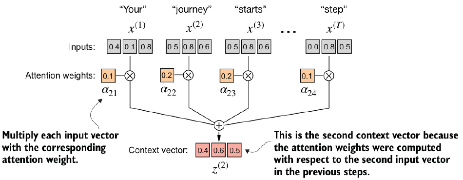 现在我们已经计算了归一化的注意力权重,接下来进入最后一步。如图 3-10 所示,通过将嵌入的输入词元 与相应的注意力权重相乘,再将得到的向量求和来计算上下文向量 。因此,上下文向量 是所有输入向量的加权总和,通过将每个输入向量与其对应的注意力权重相乘而获得: