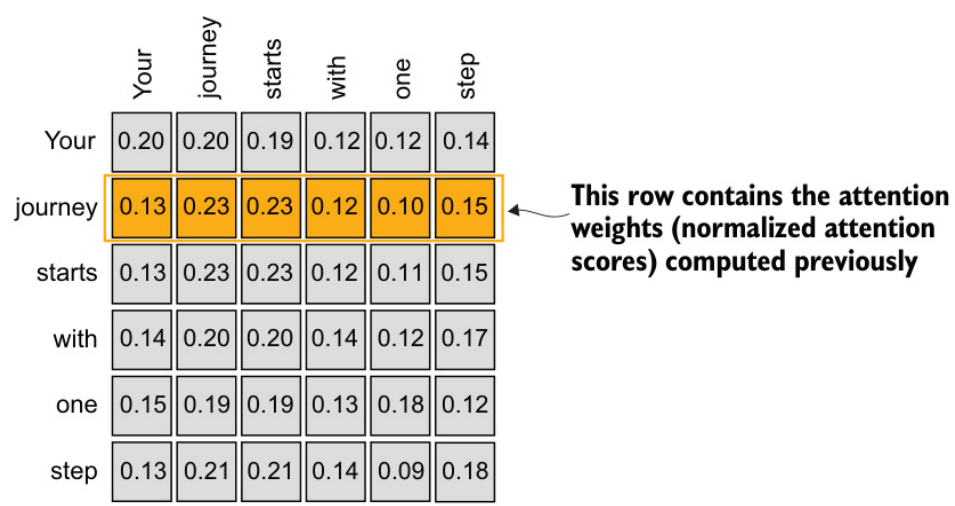 由于空间有限,图中显示的前几个输入张量的数值是截断后的版本,比如 0.87 被截断为 0.8。在这个截断 版本中,单词“journey”和“starts”的嵌入可能会由于随机原因看起来相似。