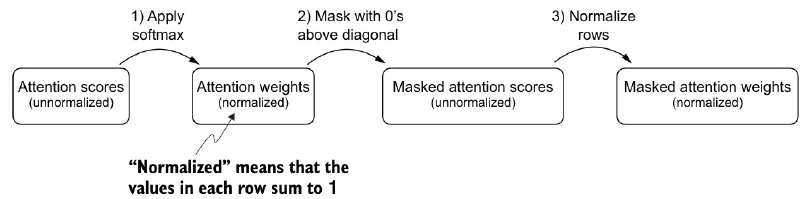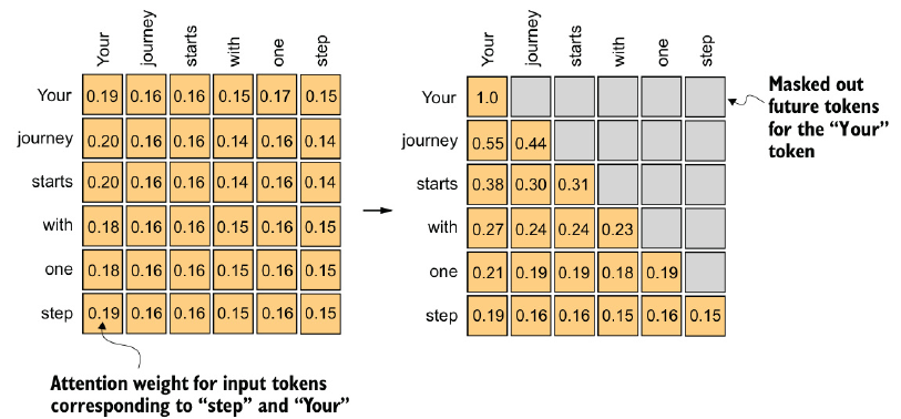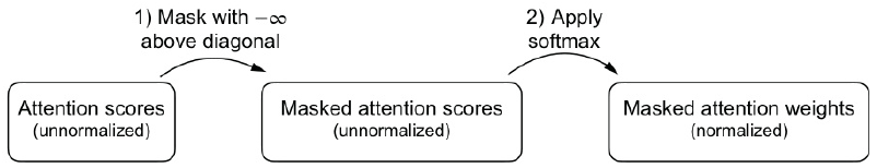 • 在处理从左到右读取和生成文本的大语言模型时,我们会添加一个因果注意力掩码,以 防止模型访问未来的词元。