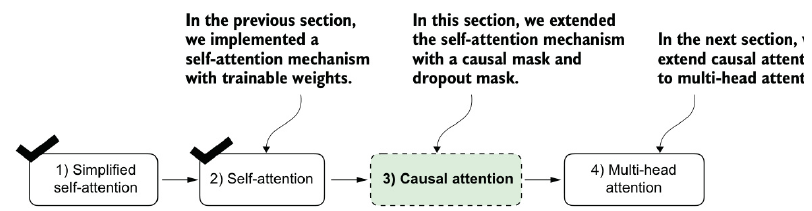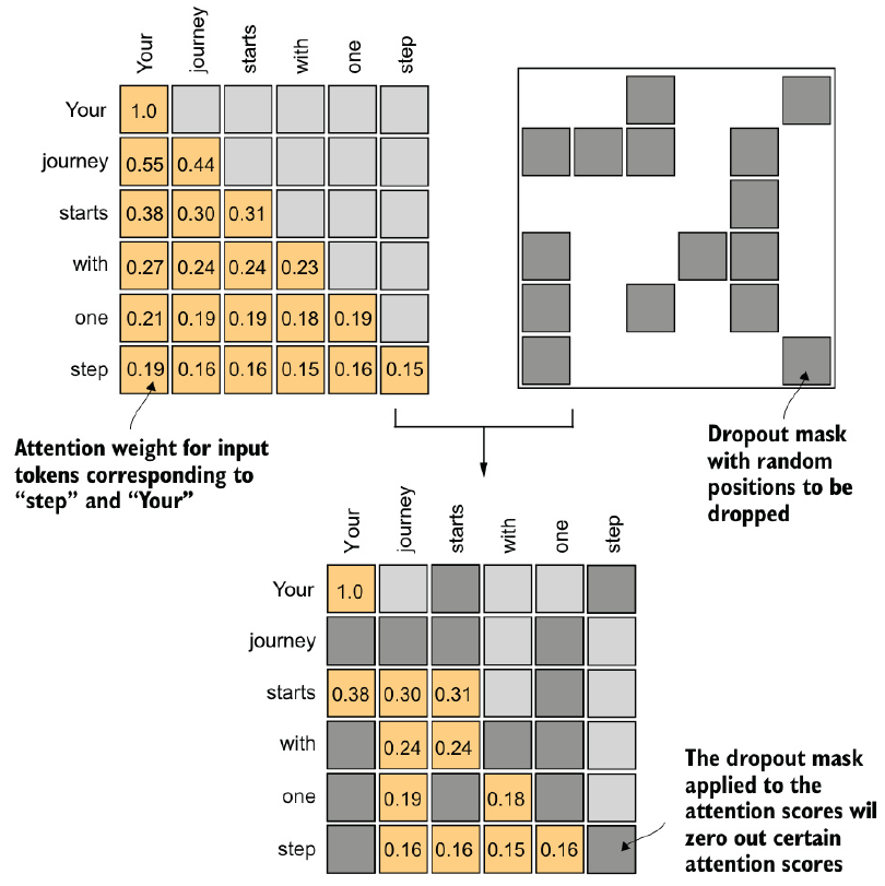 • 除了使用因果注意力掩码将注意力权重置 0,还可以添加 dropout 掩码来减少大语言模型 中的过拟合。