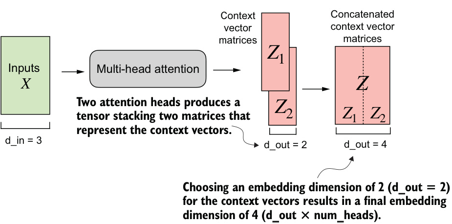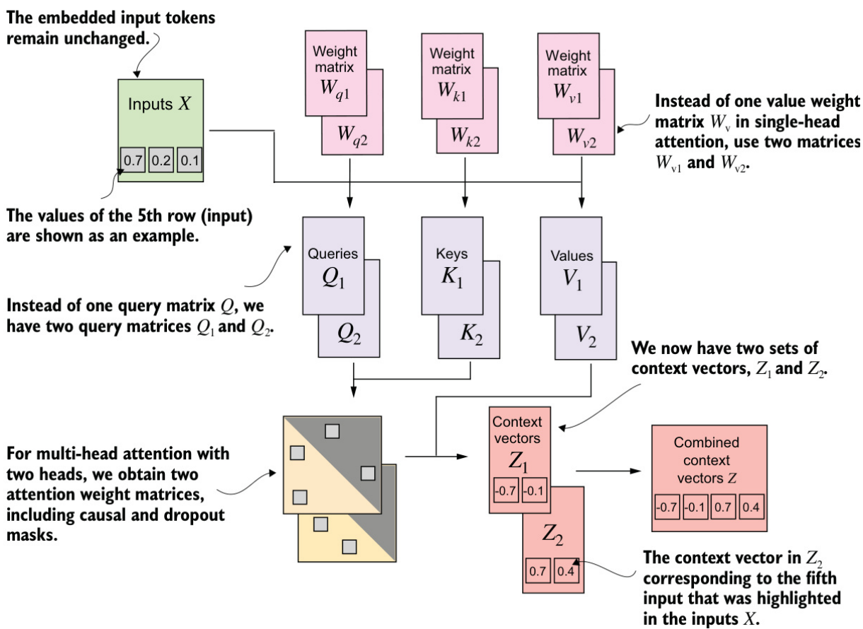 • 可以通过堆叠多个因果注意力模块实例来创建多头注意力模块。