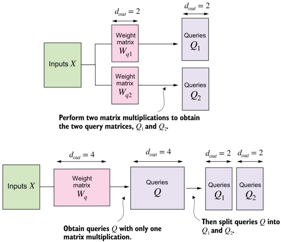 图 3-26 在具有两个注意力头的 MultiHeadAttentionWrapper 类中,我们初始化了两个权重 矩阵 ,并计算了两个查询矩阵 (上)。在 MultiHeadAttention 类 中,我们初始化了一个更大的权重矩阵 ,并只与输入矩阵进行一次矩阵乘法操作, 得到一个查询矩阵 ,然后将查询矩阵分割成了 (下)。对键矩阵和值矩阵的 操作与之类似,为了减少视觉混乱,这里没有展示