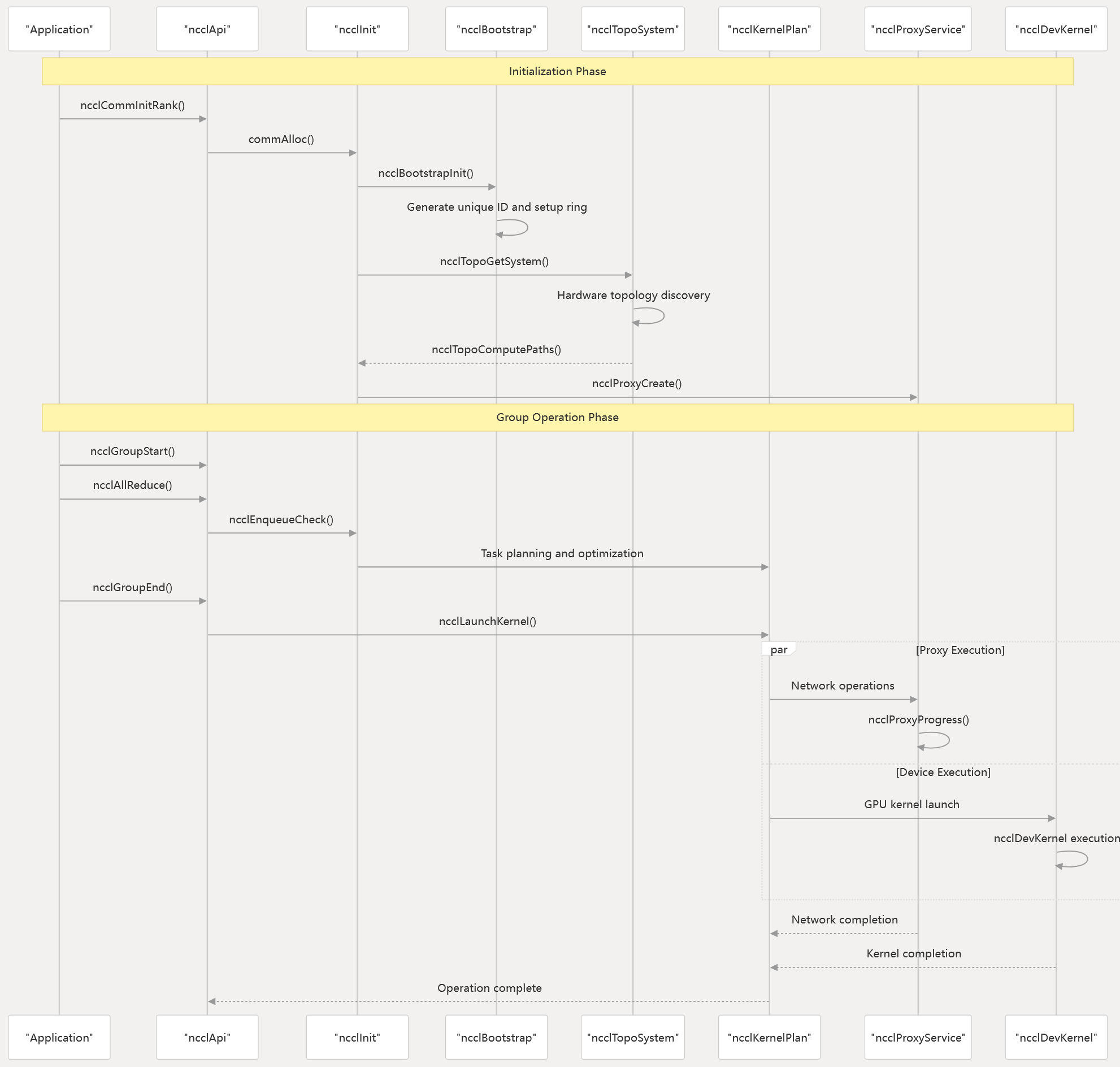 The following diagram illustrates how NCCL’s major components interact during a typical collective operation lifecycle: