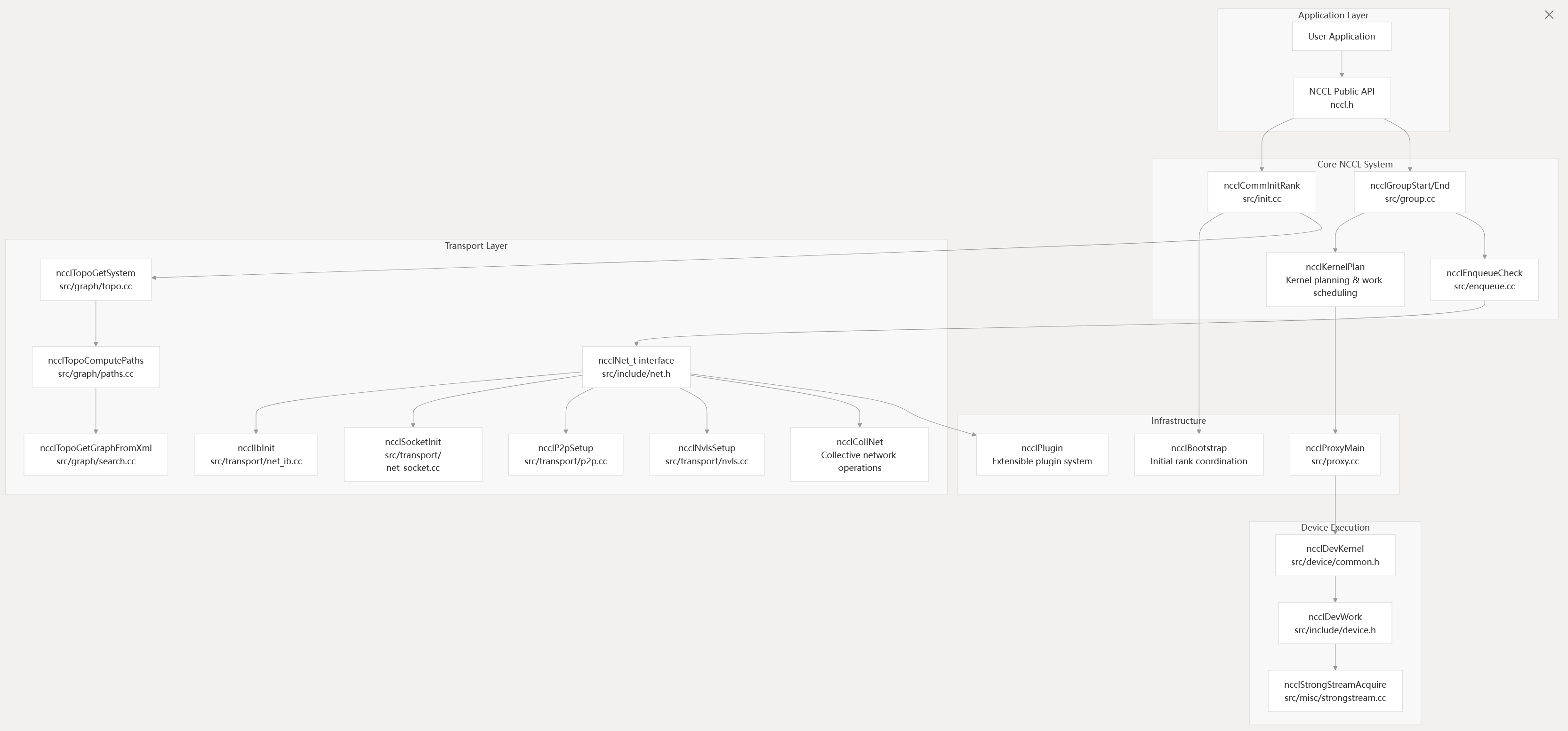 NCCL follows a layered architecture that abstracts hardware complexity while maximizing performance across different interconnect technologies.
