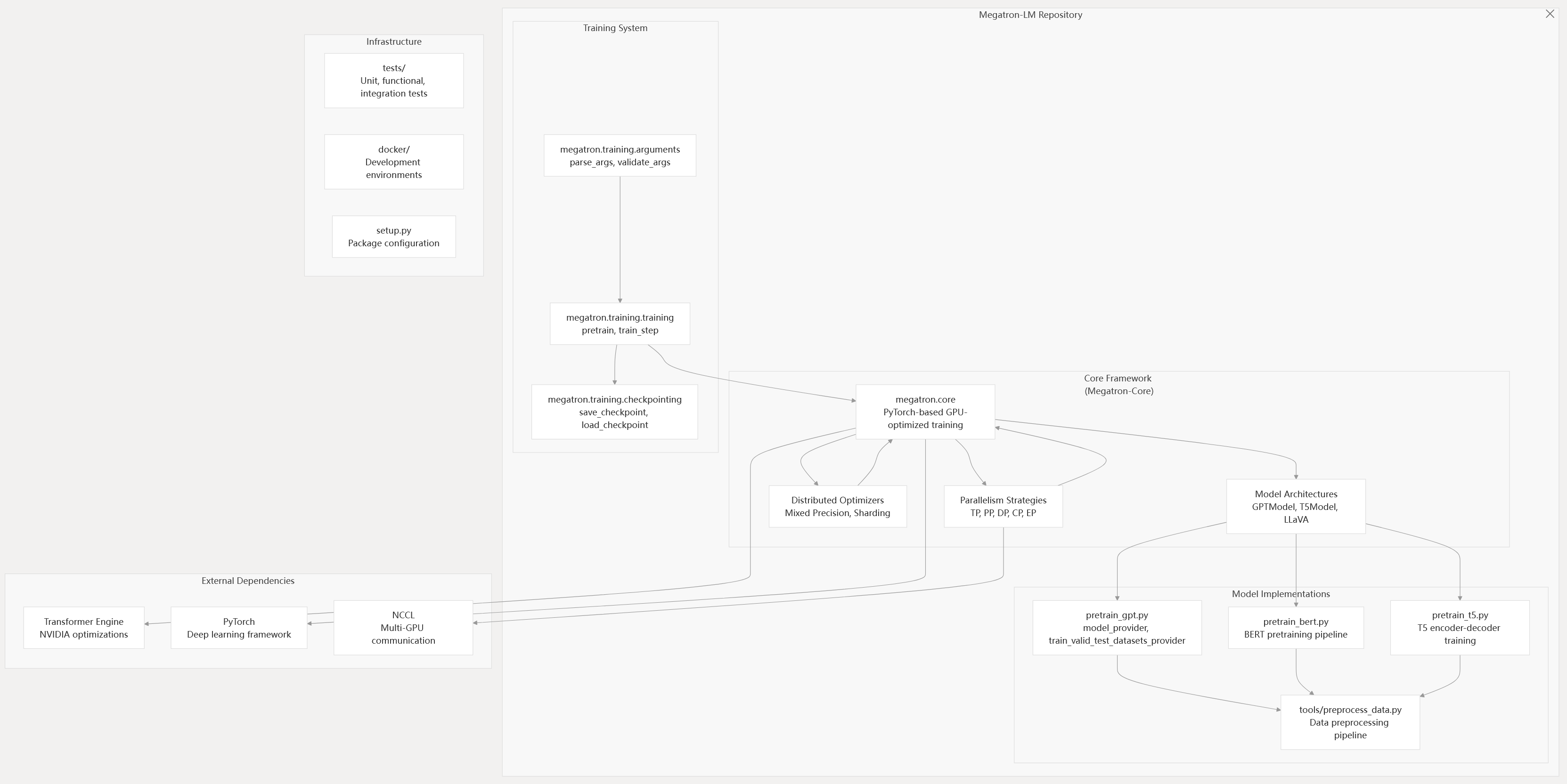 Megatron-LM implements a layered architecture centered around Megatron-Core as the foundational library, with training orchestration, model implementations, and infrastructure components built on top. The system separates core GPU-optimized techniques from research implementations and production workflows.