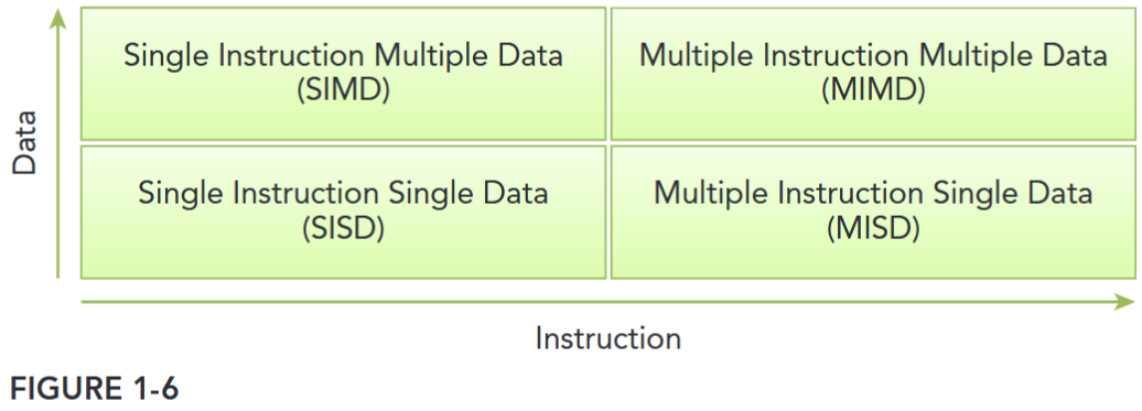 There are several different ways to classify computer architectures. One widely used classification scheme is Flynn’s Taxonomy, which classifies architectures into four different types according to how instructions and data flow through cores (see Figure 1-6), including:
