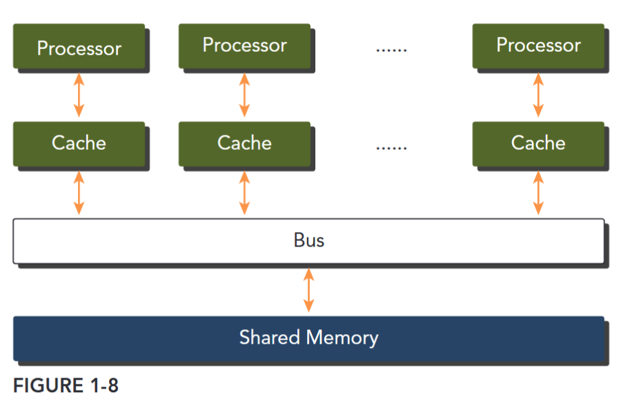 Multiprocessor architectures typically range in size from dual-processor to dozens or hundreds of processors. These processors are either physically connected to the same memory (as shown in Figure 1-8), or share a low-latency link (such as PCI-Express or PCIe). Although sharing memory implies a shared address space, it does not necessarily mean there is a single physical memory. Such multiprocessors include both single-chip systems with multiple cores, known as multicore, and computers consisting of multiple chips, each of which might have a multicore design. Multicore architectures have displaced single-core architectures permanently.