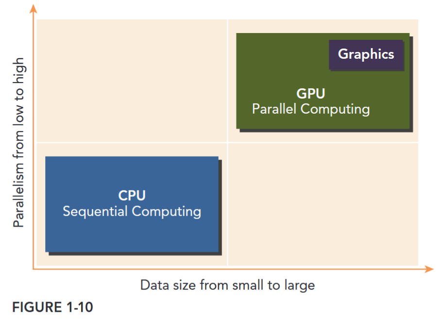 The CPU is optimized for dynamic workloads marked by short sequences of computational operations and unpredictable control flow; and GPUs aim at the other end of the spectrum: workloads that are dominated by computational tasks with simple control flow. As shown in Figure 1-10, there are two dimensions that differentiate the scope of applications for CPU and GPU: