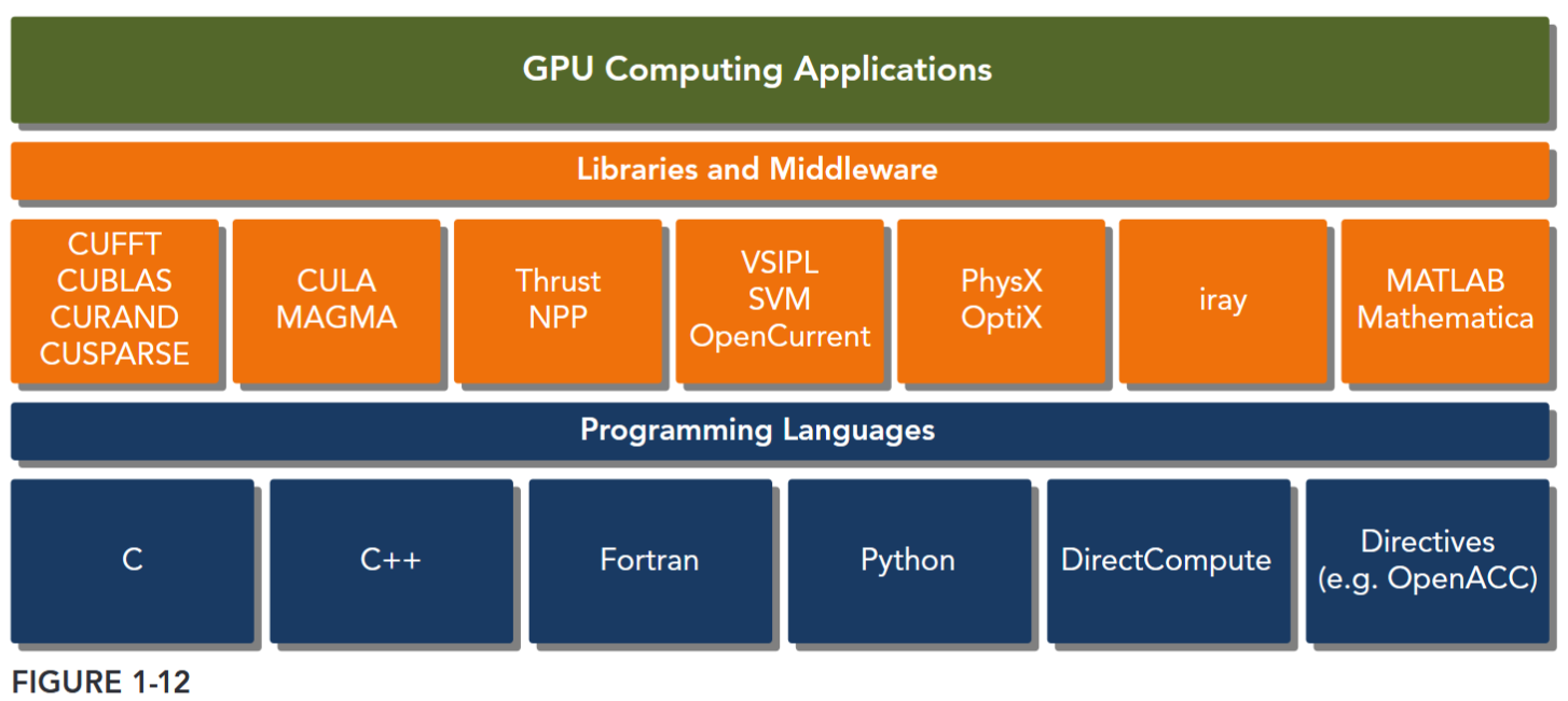 The CUDA platform is accessible through CUDA-accelerated libraries, compiler directives, application programming interfaces, and extensions to industry-standard programming languages, including C, C++, Fortran, and Python (as illustrated by Figure 1-12).