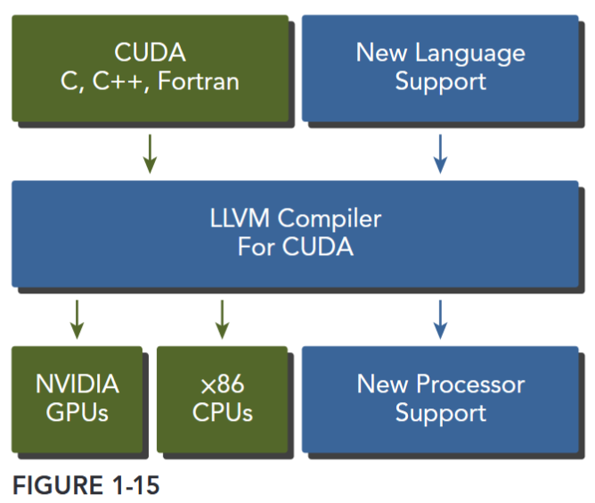 The CUDA nvcc compiler is based on the widely used LLVM open source compiler infrastructure. You can create or extend programming languages with support for GPU acceleration using the CUDA Compiler SDK, as shown in Figure 1-15.