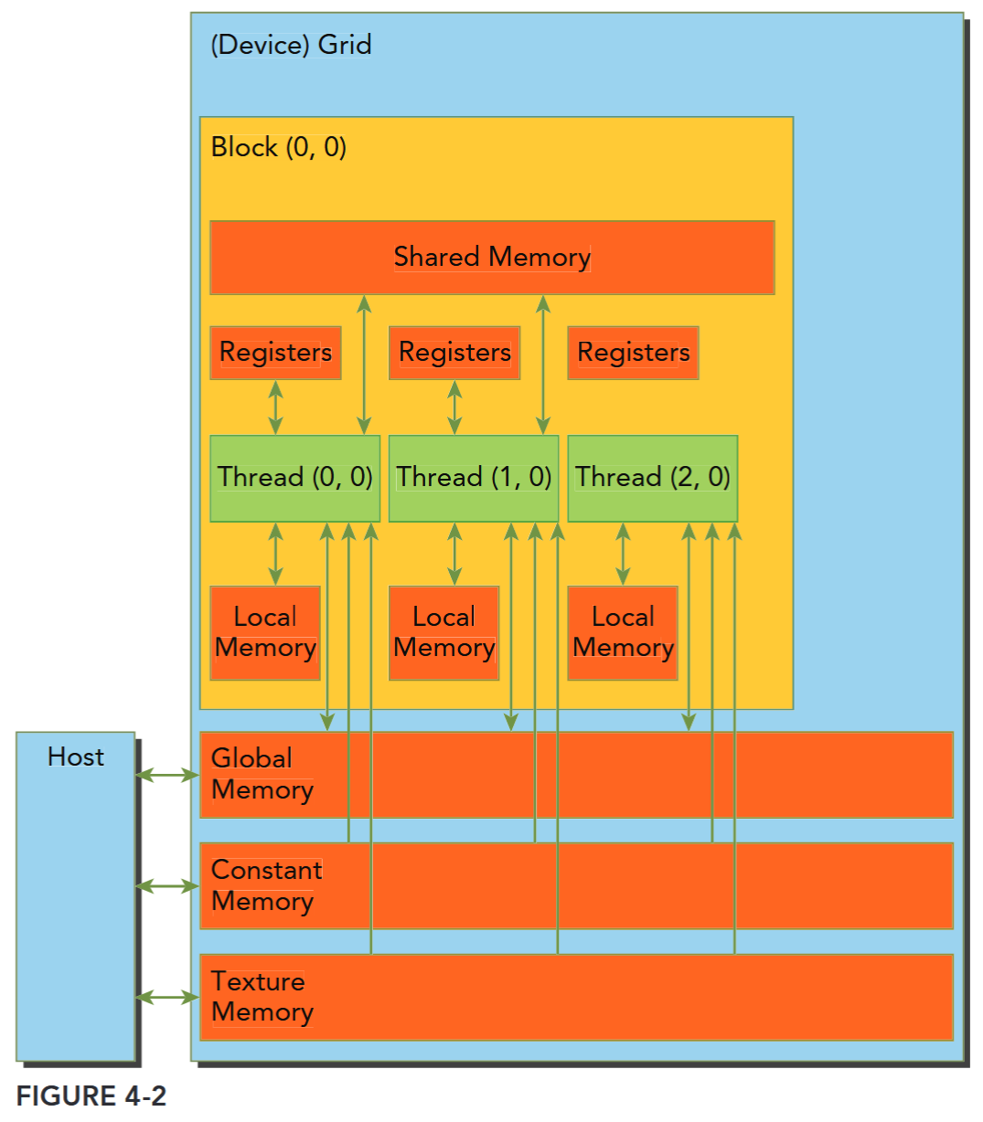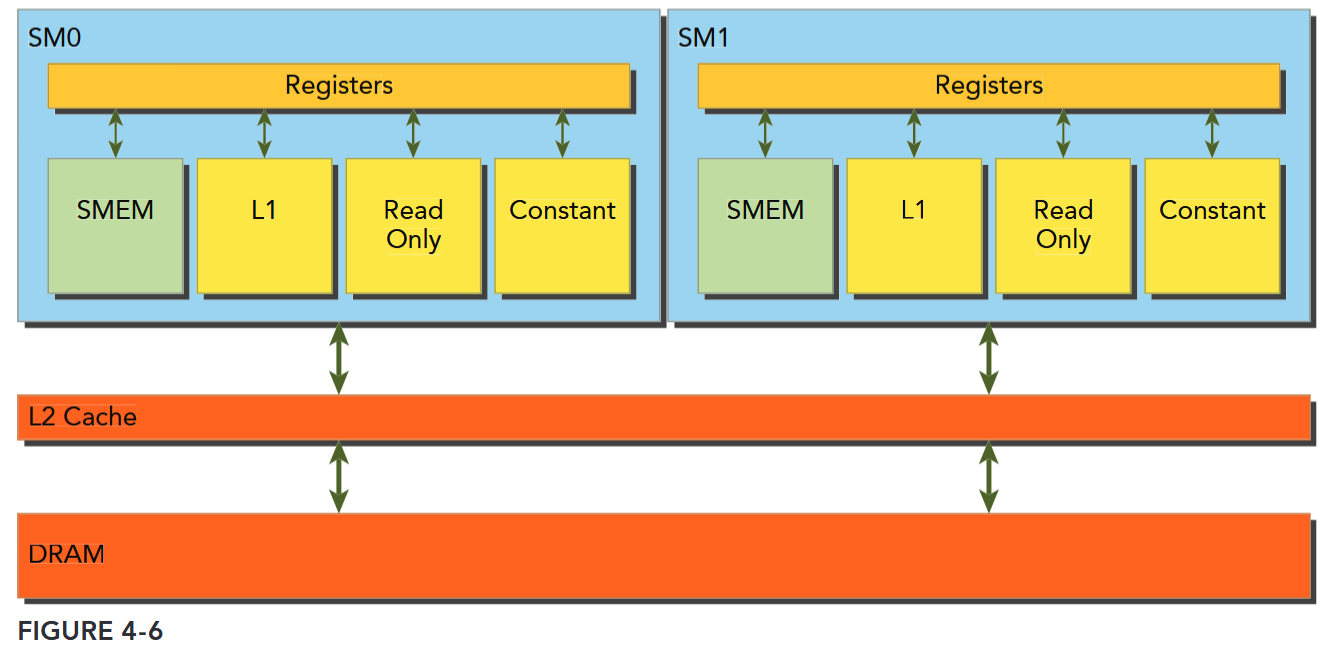 In the CPU memory hierarchy, L1 cache and L2 cache are examples of non-programmable memory. On the other hand, the CUDA memory model exposes many types of programmable memory to you: