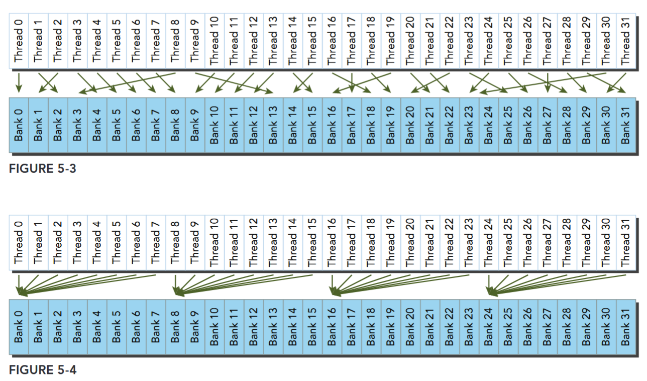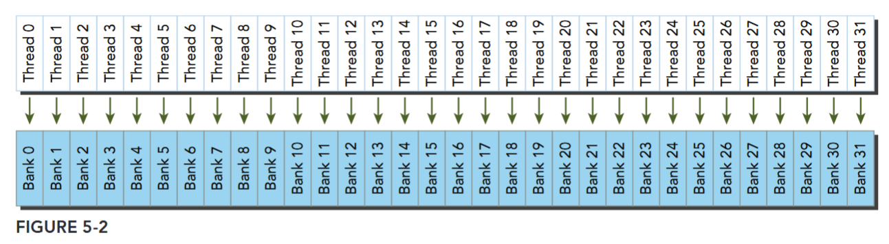 Because shared memory is on-chip, it has a much higher bandwidth and much lower latency than local or global memory. It is used similarly to CPU L1 cache, but is also programmable. Each SM has a limited amount of shared memory that is partitioned among thread blocks. Therefore, you must be careful to not over-utilize shared memory or you will inadvertently limit the number of active warps.