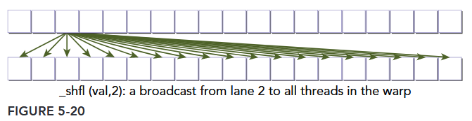 Then threads 0 through 15 would receive the value of x from thread 3, and threads 16 through 31 would receive the value of x from thread 19 (the thread with offset 3 in the top 16 threads of the warp). For simplicity, srcLane will be referred to as a lane index for the remainder of this section. When the lane index passed to shfl is the same value for all threads in a warp, the instruction performs a warp broadcast operation from the specified lane to all threads in the warp, as illustrated in Figure 5-20.