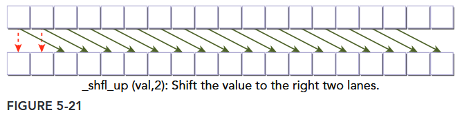 __shfl_up calculates the source lane index by subtracting delta from the caller’s lane index. The value held by the source thread is returned. Hence, this instruction shifts var up the warp by delta lanes. There is no wrap around with __shfl_up, so the lowest delta threads in a warp will be unchanged, as illustrated in Figure 5-21.