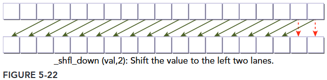 __shfl_down calculates a source lane index by adding delta to the caller’s lane index. The value held by the source thread is returned. Hence, this instruction shifts var down the warp by delta lanes. There is no wrap around when using __shfl_down, so the upper delta lanes in a warp will remain unchanged, as illustrated in Figure 5-22.