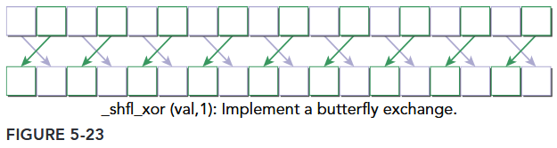 The intrinsic instruction calculates a source lane index by performing a bitwise XOR of the caller’s lane index with laneMask. The value held by the source thread is returned. This instruction facilitates a butterfly addressing pattern, as illustrated in Figure 5-23.