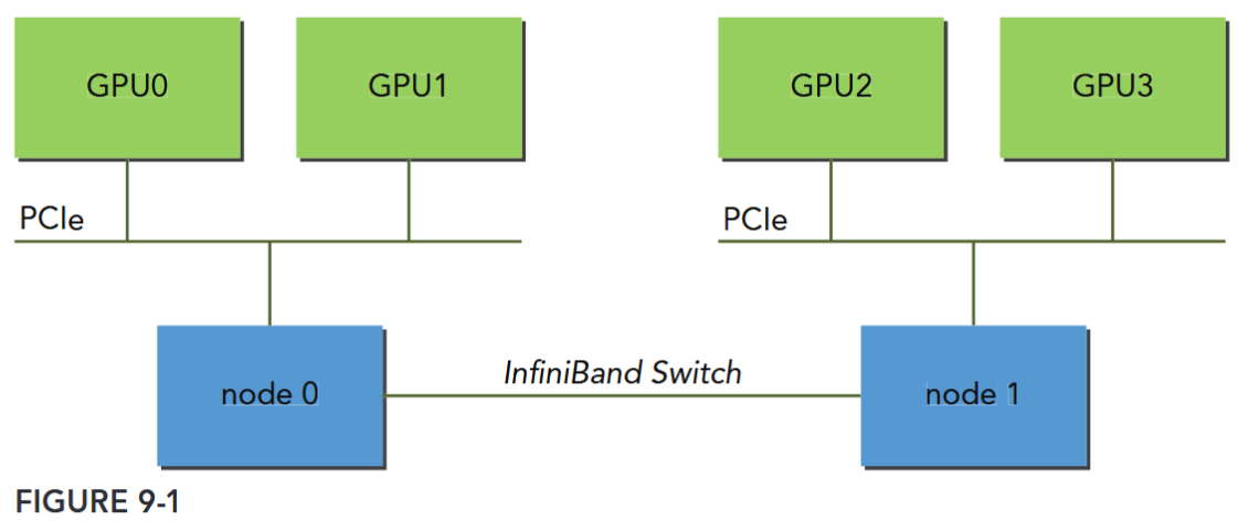 These connection topologies are not mutually exclusive. Figure 9-1 illustrates a simplified topology for a cluster with two compute nodes. GPU0 and GPU1 are connected via the PCIe bus on node0. Similarly, GPU2 and GPU3 are connected via the PCIe bus on node1. The two nodes (node0 and node1) are connected to each other through InfiniBand Switch.