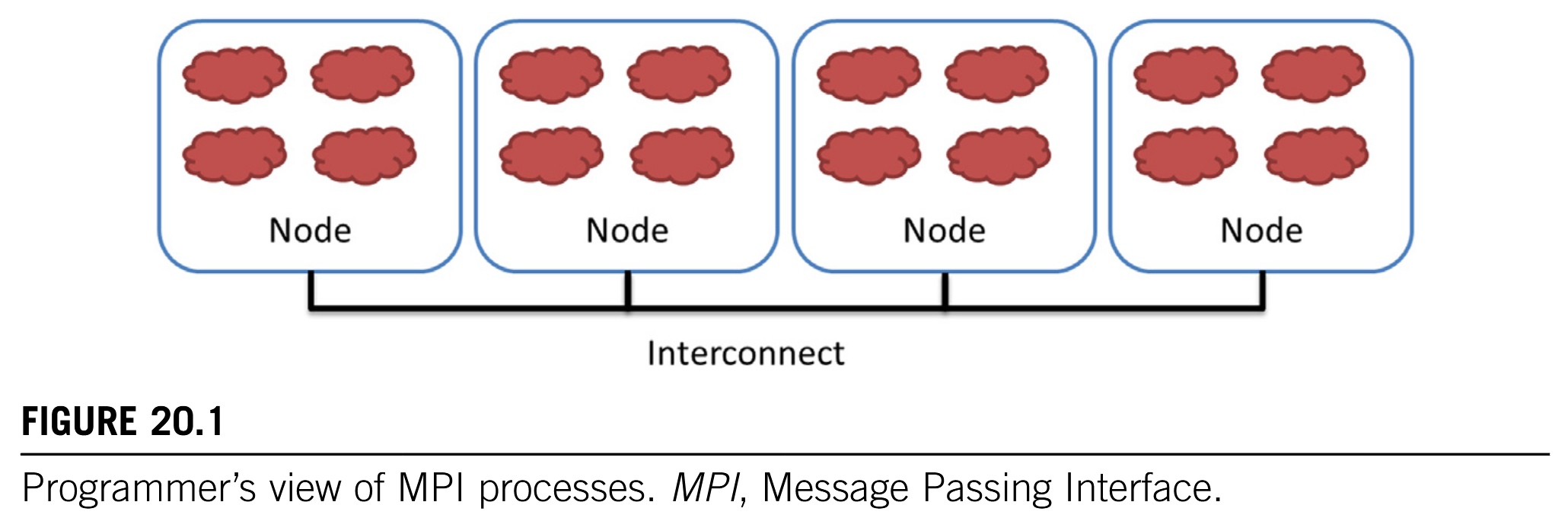 In a typical MPI application, data and work are partitioned among processes. As is shown in Fig. 20.1, each node can contain one or more processes, shown as clouds within nodes. As these processes progress, they may need data from each other. This need is satisfied by sending and receiving messages. In some cases, the processes also need to synchronize with each other and generate collective results when collaborating on a large task. This is done with collective communication API functions.