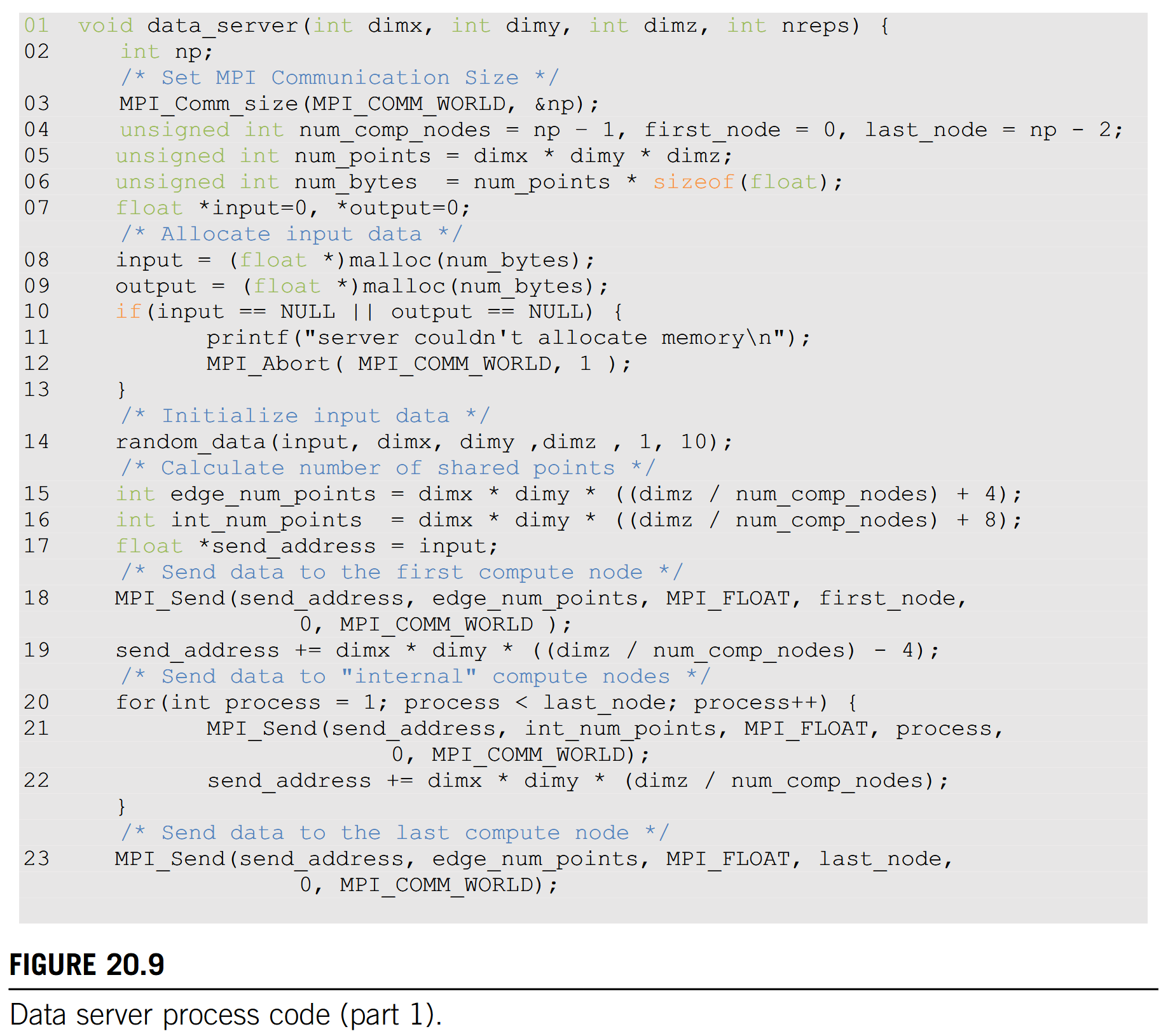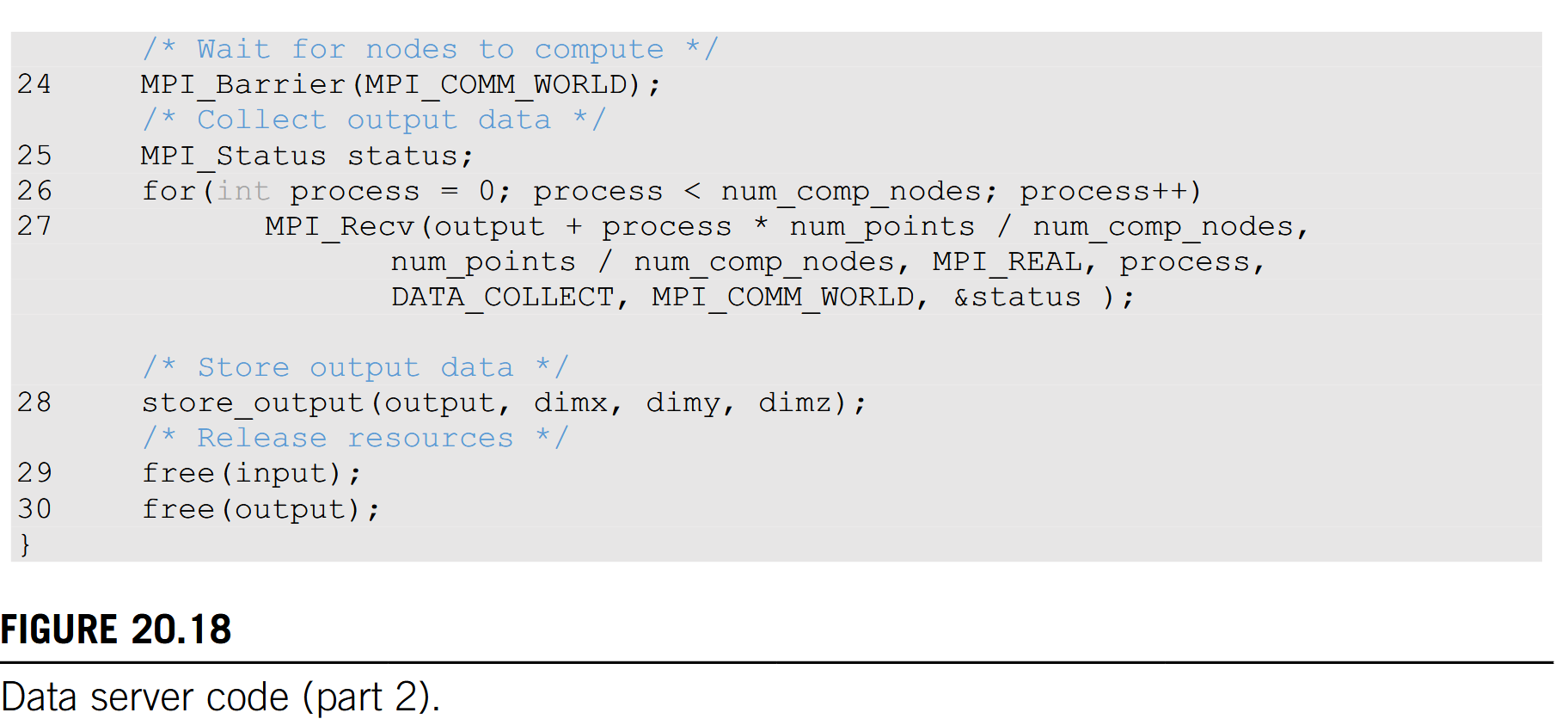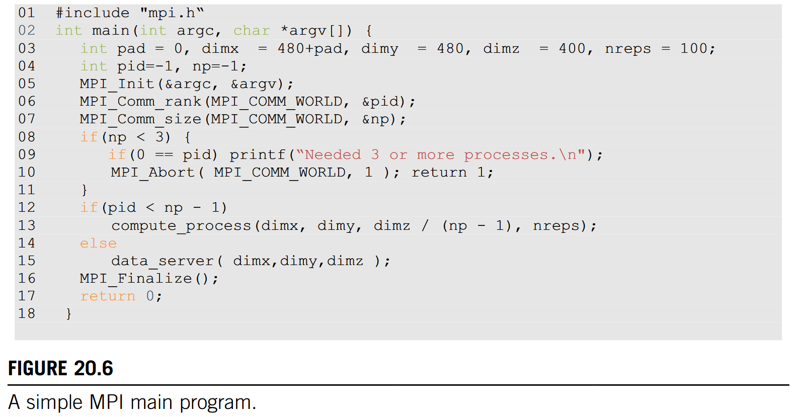If the number of processes satisfies the requirement, the application program goes on to perform the calculation. In Fig. 20.6, the application uses np - 1 processes (pid from 0 to np - 2) to perform the calculation (lines 12 13) and one process (the last one whose pid is np - 1) to perform I/O service for the other processes (lines 14 15). We will refer to the process that performs the I/O services as the data server and the processes that perform the calculation as compute processes. In Fig. 20.6, if the pid of a process is within the range from 0 to np - 2, it is a compute process and calls the compute_process () function (line 13). If the process pid is np - 1, it is the data server and calls the data_server () function (line 15). This is similar to the pattern in which threads perform different actions according to their thread ids.