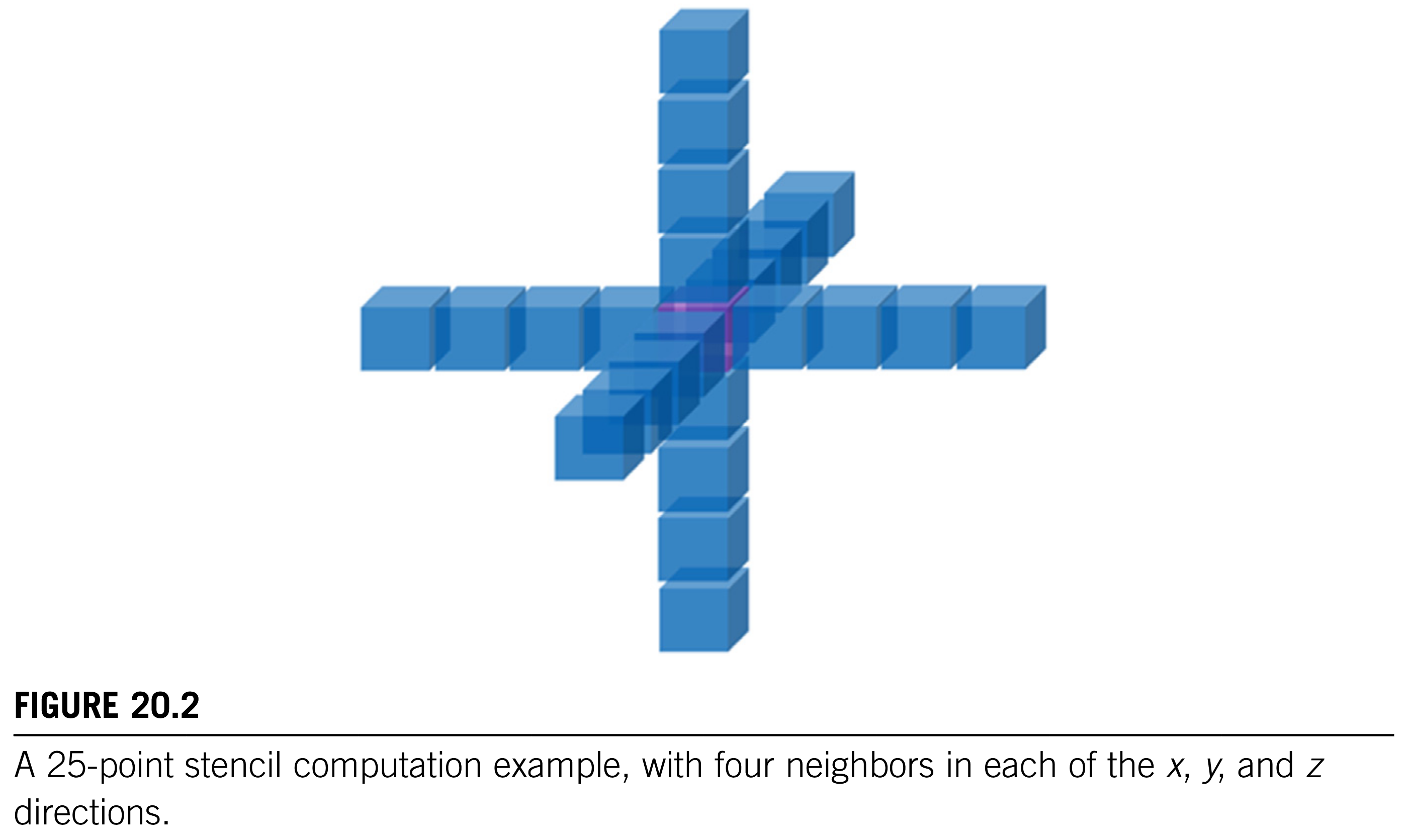 We will use a simple MPI program, shown in Fig. 20.6, to illustrate the usage the API functions. To launch an MPI application in a cluster, a user needs to supply the executable file of the program to the mpirun command or the mpiexec command in the login node of the cluster. Each process starts by initializing the MPI runtime with an MPI_Init () call (line 05). This initializes the communication system for all the processes that are running the application. Once the MPI runtime has been initialized, each process calls two functions to prepare for communication. The first function is MPI_Comm_rank () (line 06), which returns a unique number to each calling process, which is called the MPI rank or process id for the process. The numbers that are received by the processes vary from 0 to the number of processes minus 1. The MPI rank for a process is analogous to the expression blockIdx.x * blockDim.x + threadIdx.x for a CUDA thread. It uniquely identifies the process in a communication, which is also equivalent to the phone number in a telephone system. The main differences are that MPI ranks are one-dimensional.