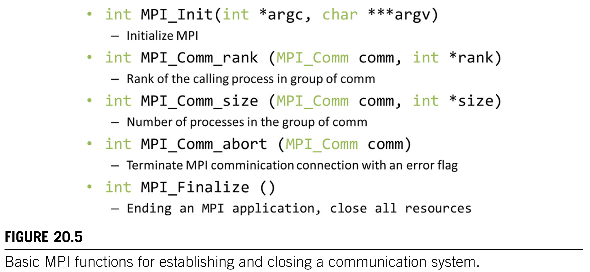 All MPI processes execute the same program. The MPI system provides a set of API functions to establish communication systems that allow the processes to communicate with each other. Fig. 20.5 shows five essential MPI functions that set up and tear down the communication system for an MPI application.
