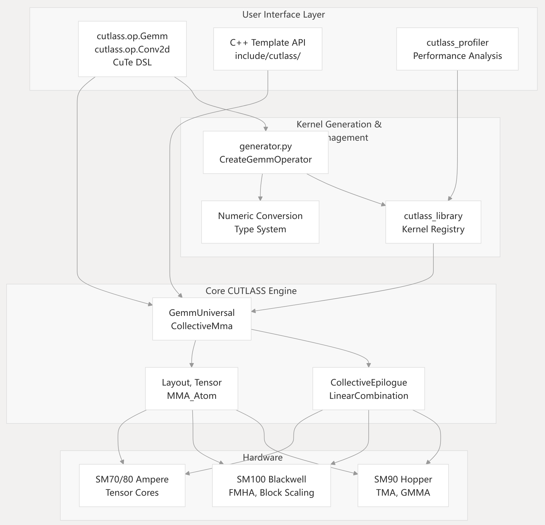 CUTLASS follows a layered architecture that supports both high-level Python DSL and low-level C++ template interfaces, with automatic kernel generation and hardware-specific optimizations.